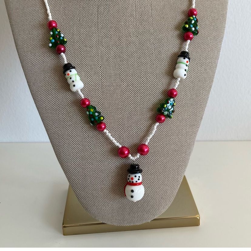 Cheerful lampwork glass snowman and Shiny Brite style beaded necklace. This is an upcycled design using vintage beads and findings. The length measures 26” long and fastens with barrel closure.