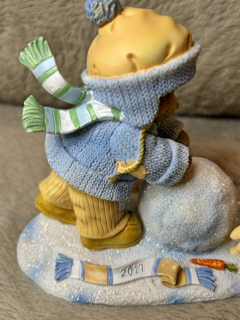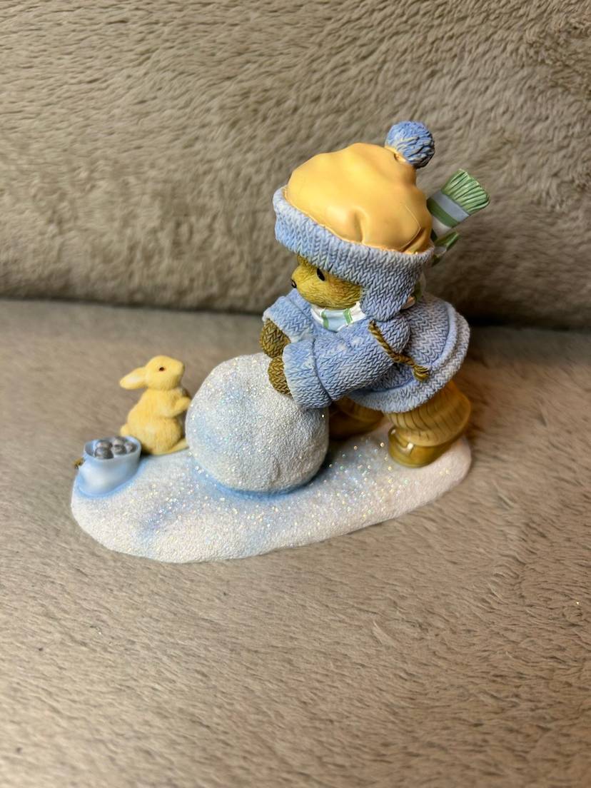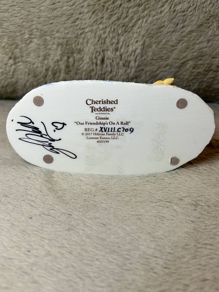 This is the Ginnie" figurine from the Cherished Teddies collection, titled "Our Friendship's On A Roll". The figurine is a collectible created by Priscilla and Glenn Hillman and distributed by Enesco, LLC.