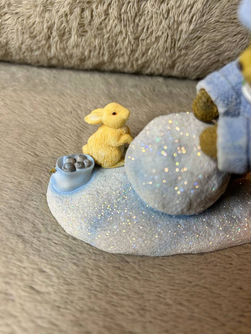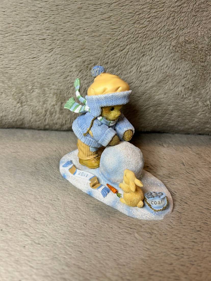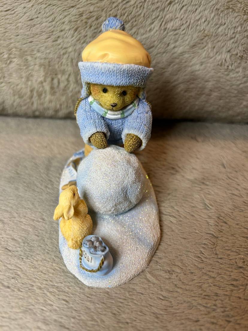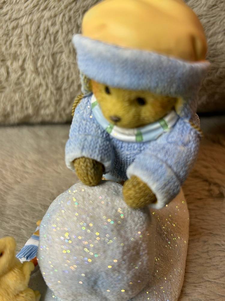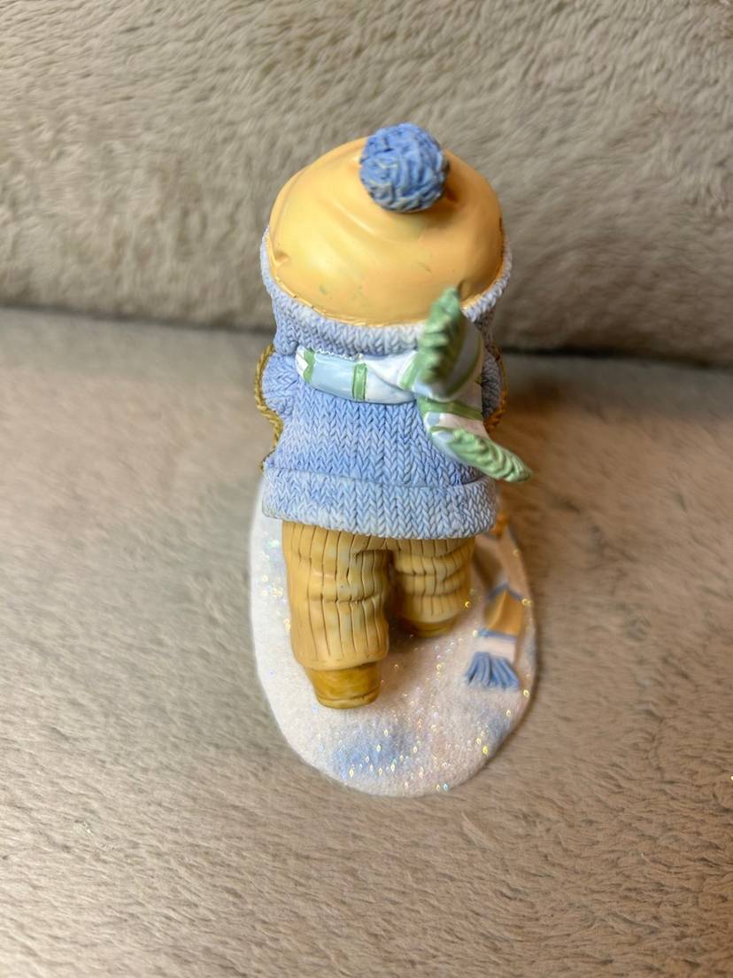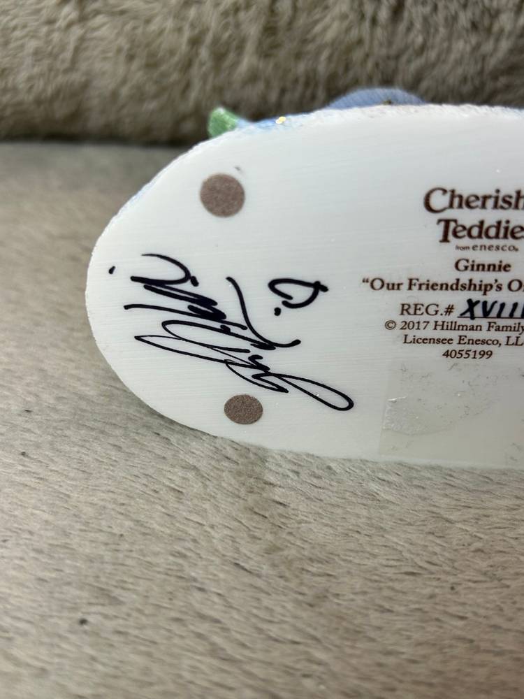 This is the Ginnie" figurine from the Cherished Teddies collection, titled "Our Friendship's On A Roll". The figurine is a collectible created by Priscilla and Glenn Hillman and distributed by Enesco, LLC.