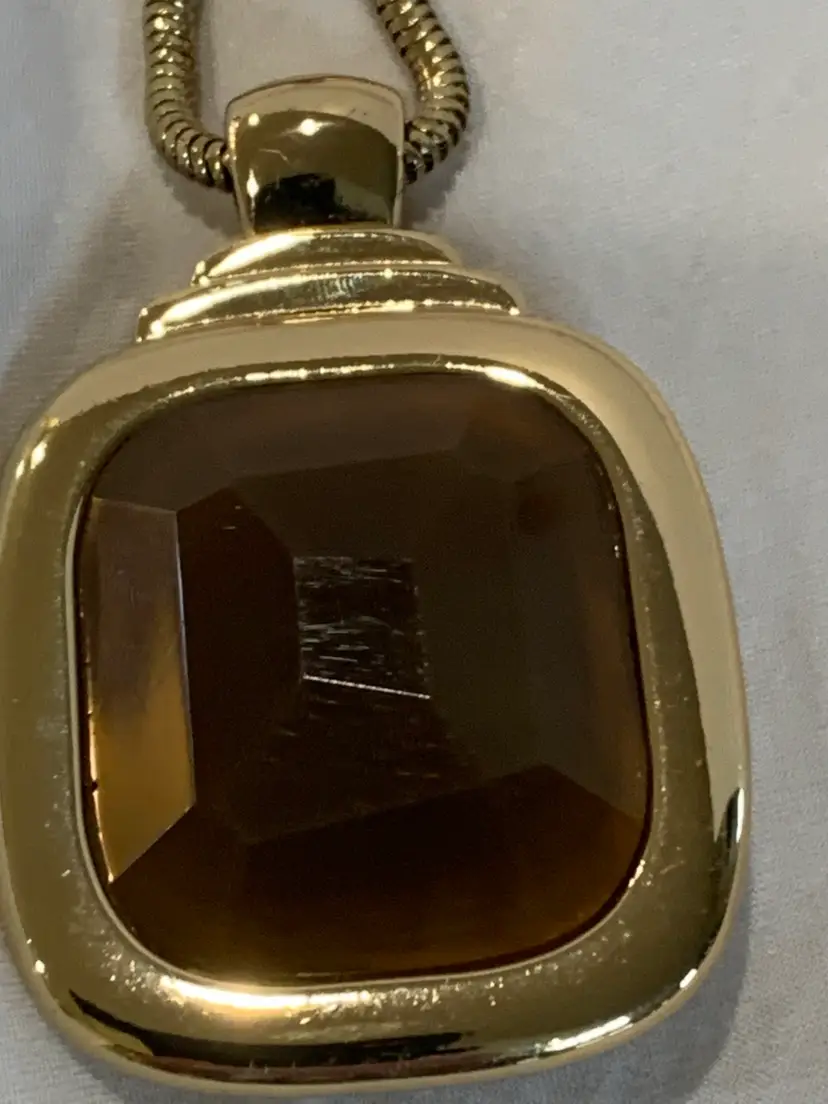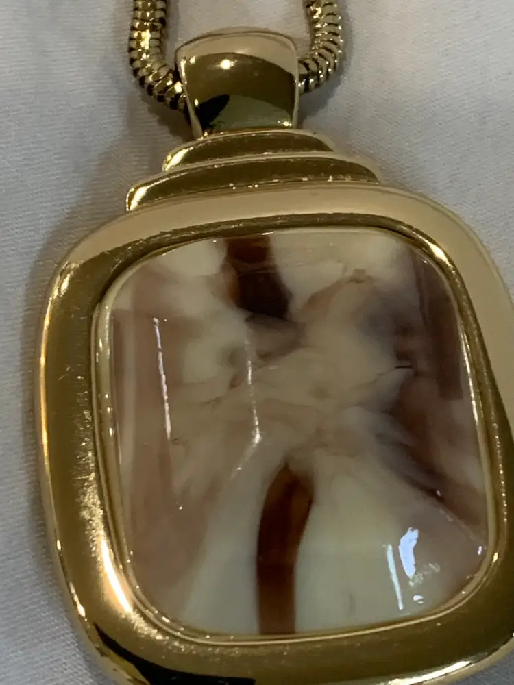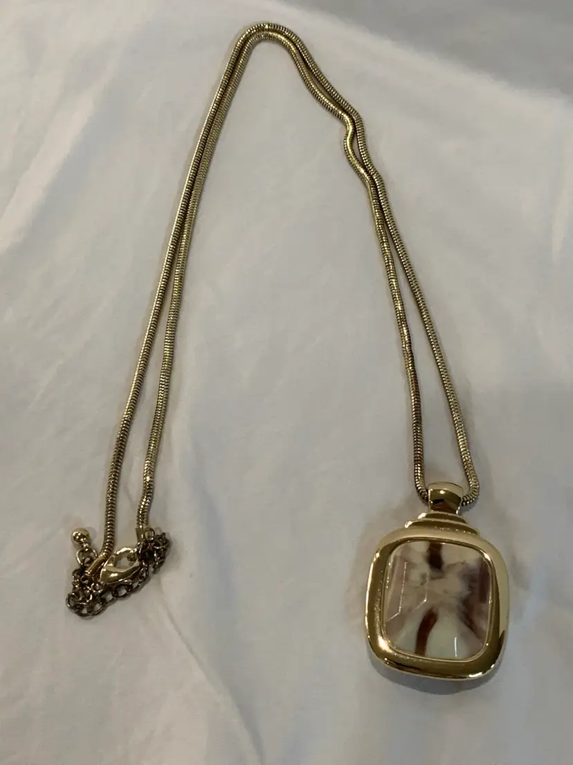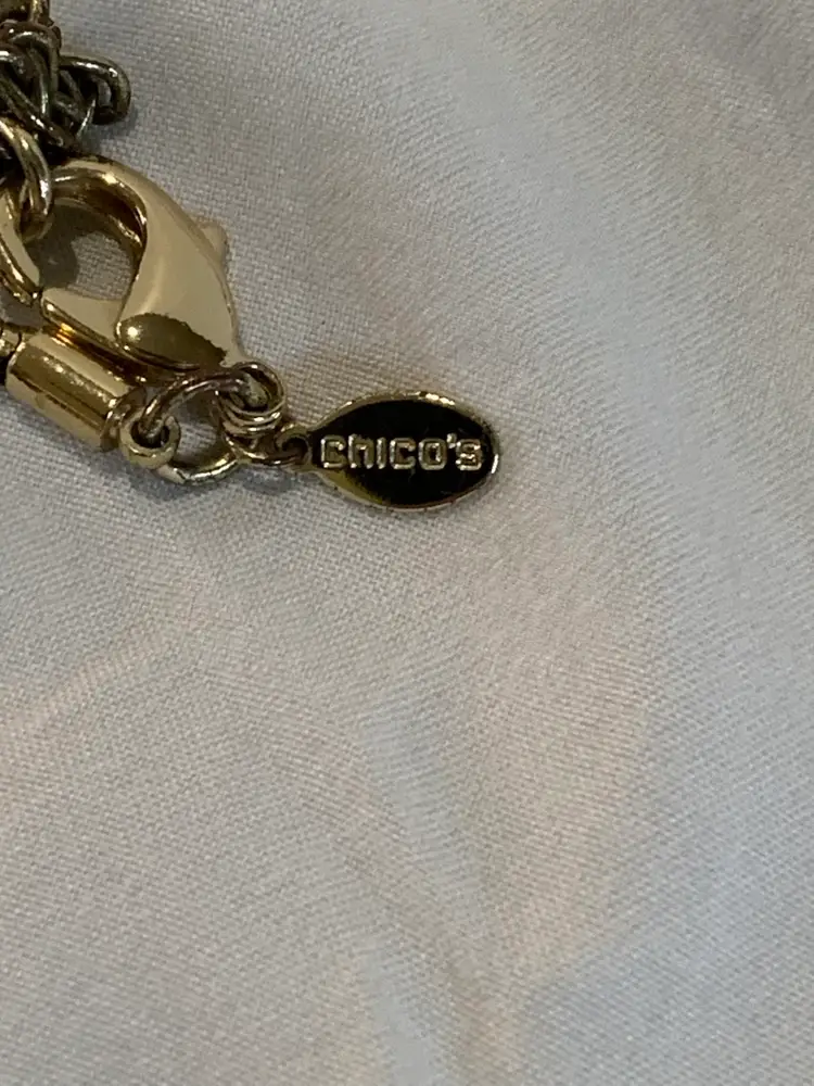 Beautiful 17” long, gold, brown, and marbled necklace. Made by Chico’s. Pendant is reversible.