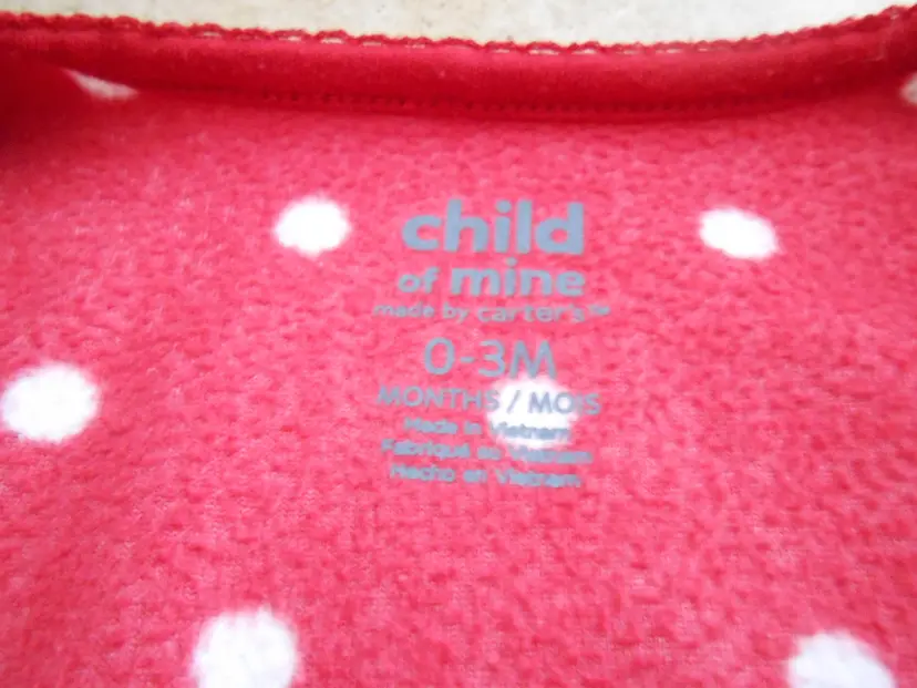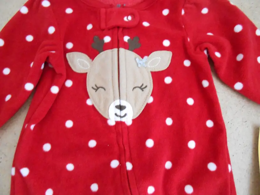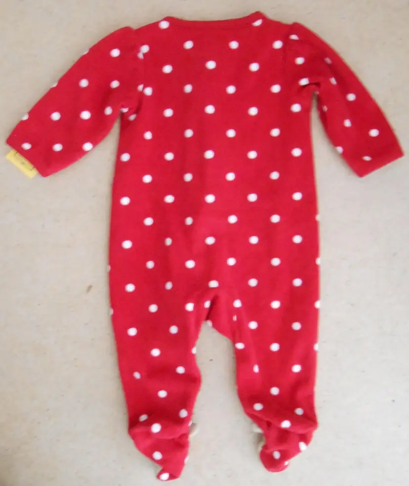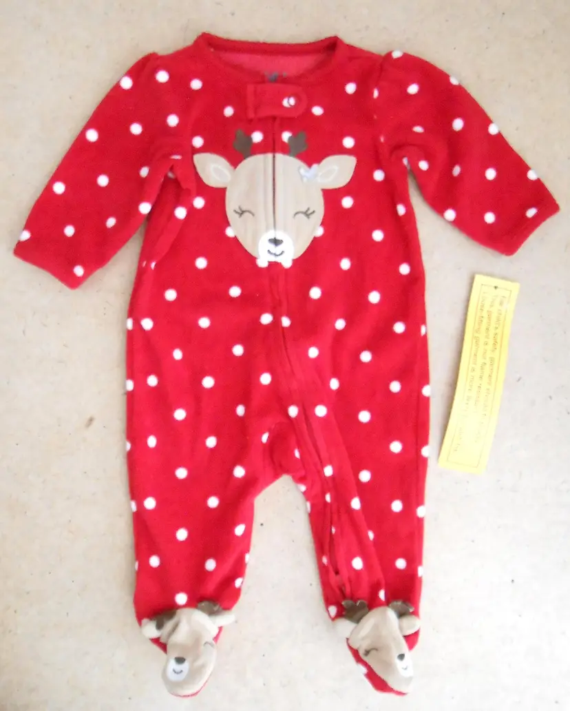 Get your little one ready for the holiday season with these adorable Child of Mine by Carter's reindeer one-piece footed pajamas. The polka dot pattern, long sleeves, and zip closure make them perfect for any occasion. These pajamas come in a vibrant red color and are suitable for babies aged 0-3 months. The pajamas are not only cute but also comfortable, making them a perfect addition to your baby's wardrobe. They are made in Vietnam and are of high quality. The pajamas feature a Christmas theme, making them a great gift option for the festive season.