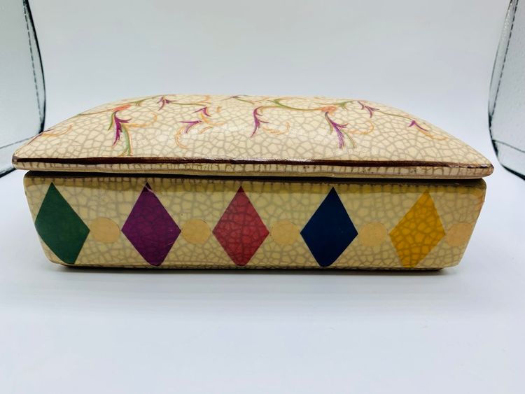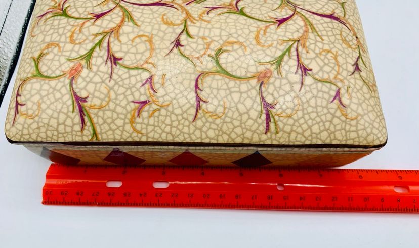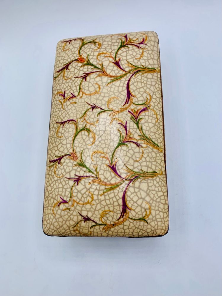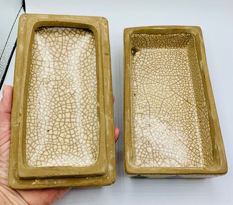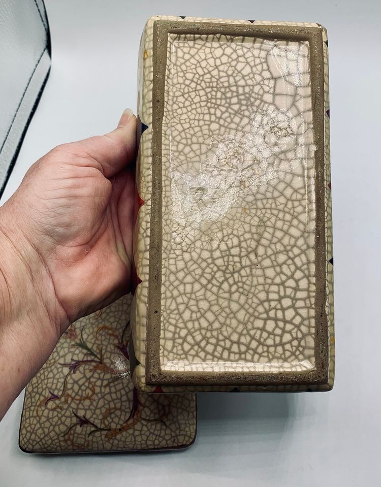 This Chinese Ge Ware Style Trinket Box features a rectangular shape with a crackle glaze finish, giving it a vintage and unique look. The piece is adorned with floral and diamond patterns, making it a stylish addition to any room. It is medium in size, measuring 8” in length, 4” in width, and 3” in height, and is unboxed, making it a standalone piece.