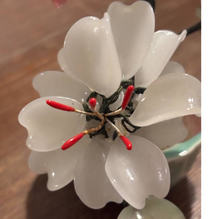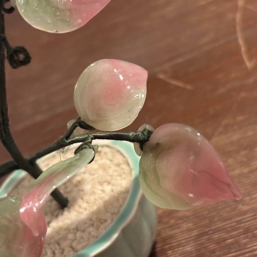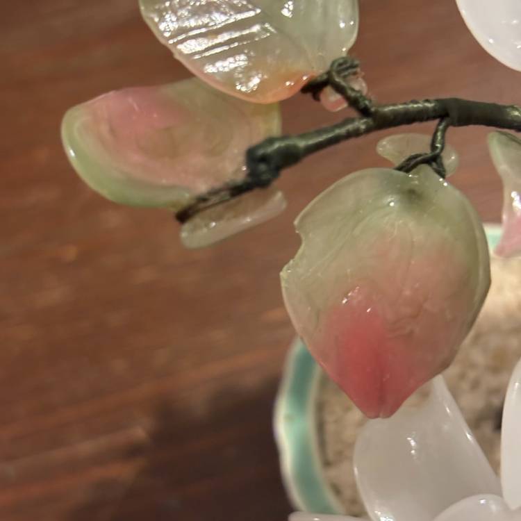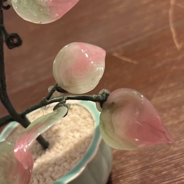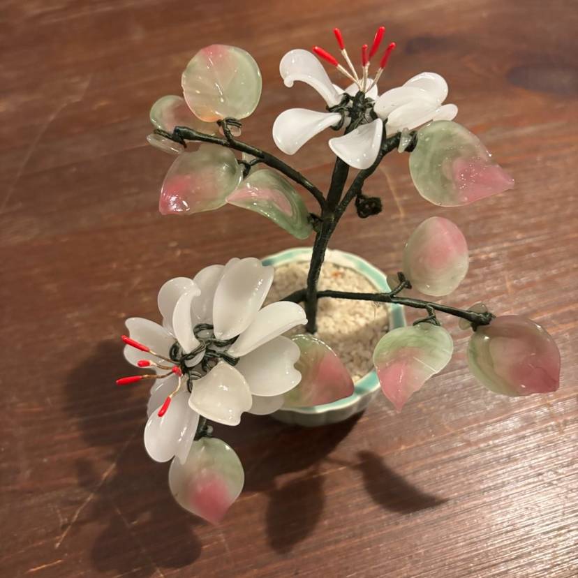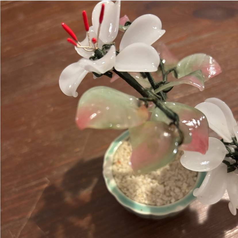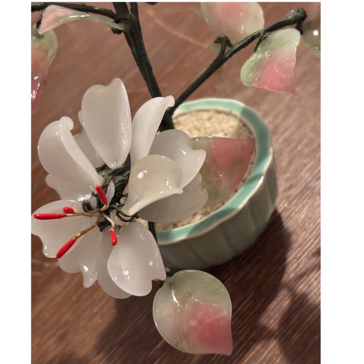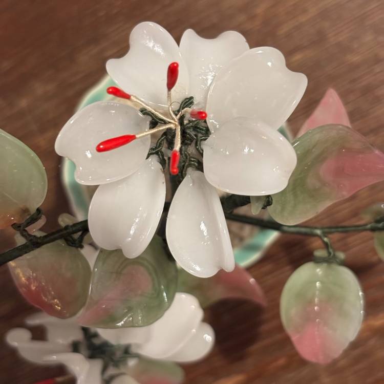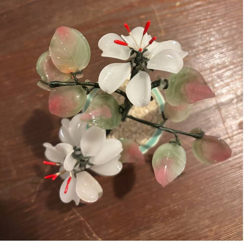 Approx. 7” tall Vintage Glass bonsai tree White flower petals with beautiful mixed pink and green leaves! One leaf broke off one has a small chip.