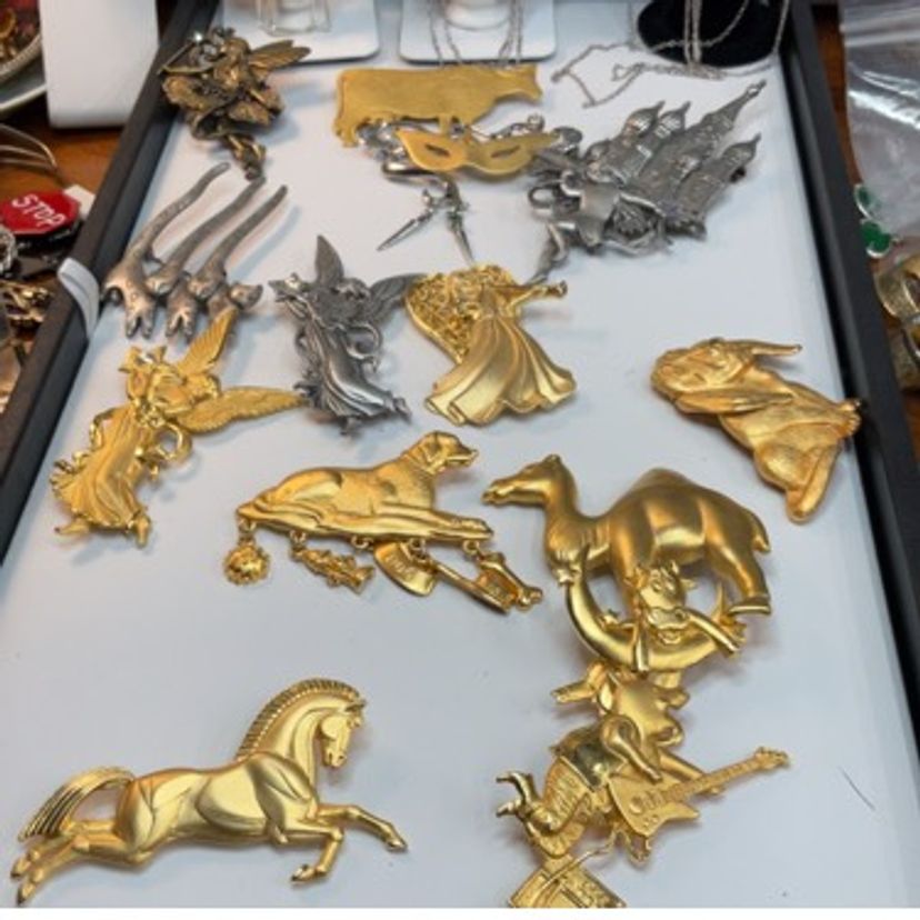 Welcome to our shop of mostly pre-owned and sometimes new jewelry treasures, trinket boxes, compacts - sometimes art and glass. Please follow us so you're in the know when we go live or add new items. Our curated beauties include a large selection of vintage pieces as well as many contemporary items. We also craft and design our own fun costume (and some fine) jewelry pieces, bookmarks, digital art and more in our small studio.