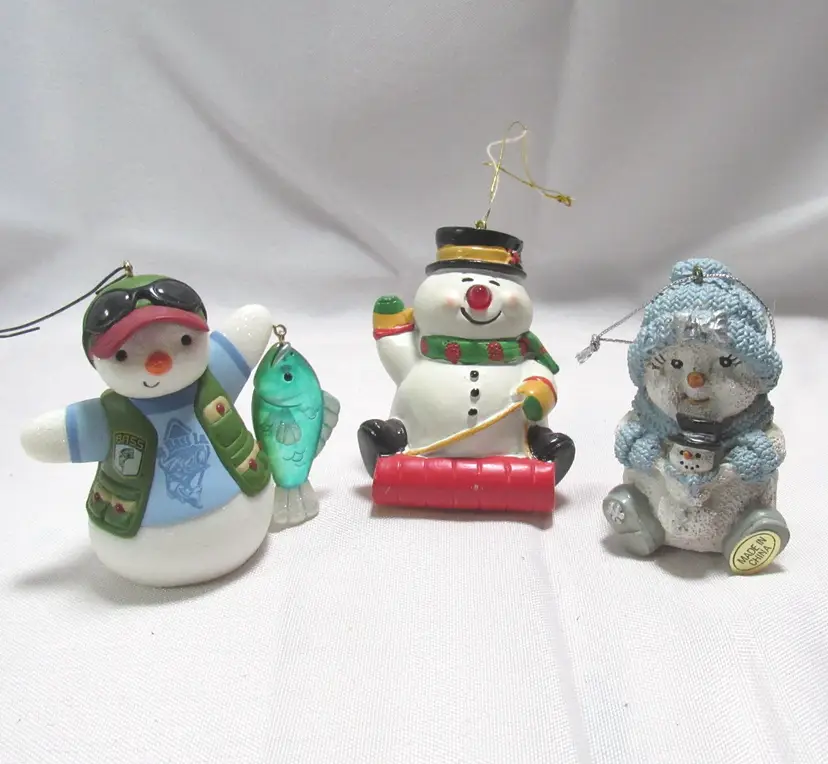 2010 Hallmark Fishing Snowman Approx 2.75" tall Avon Non Working Lighted Nose Snowman Approx 2.75" tall Snowman in Scarf & BeanieApprox 2.5" tall