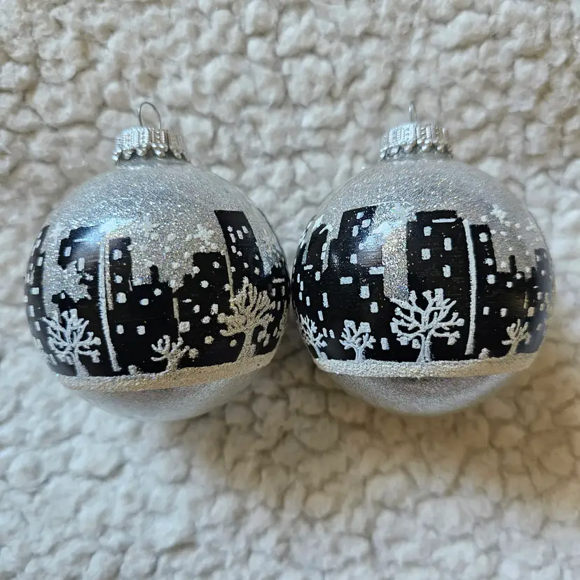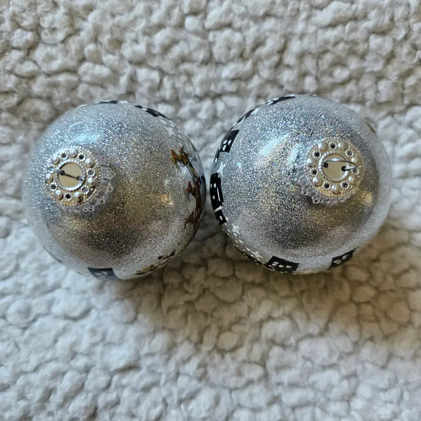 Christmas By Krebs Glass Ornaments Santa Flying Over A City Clear Silver Glitter