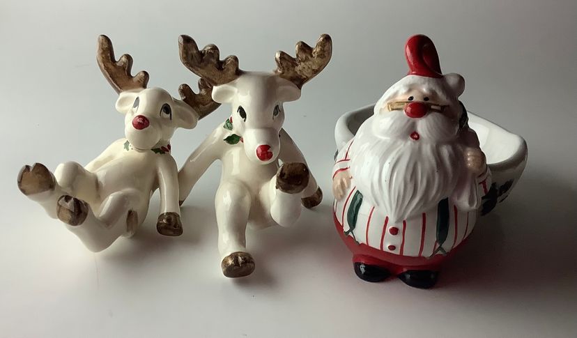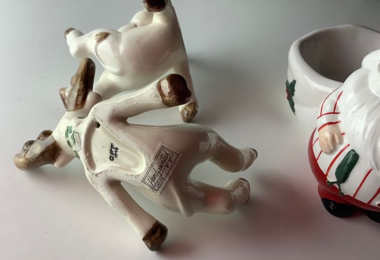 These are in nice condition, no chips, cracks or damage. Santa trinket tray Measures 4” tall, 8” long and 3.5” wide. From Omnibus/Fitz Floyd. Hand painted. Sitting reindeer is 3.5” tall x 3.25” long. Reclining reindeer measures 2” tall x 4” long. 1983 marked on bottom. I appreciate your interest! I ship UPS 3 day and pack securely for transport. Thanks! 😎❤️👍🏼💥