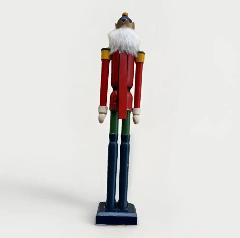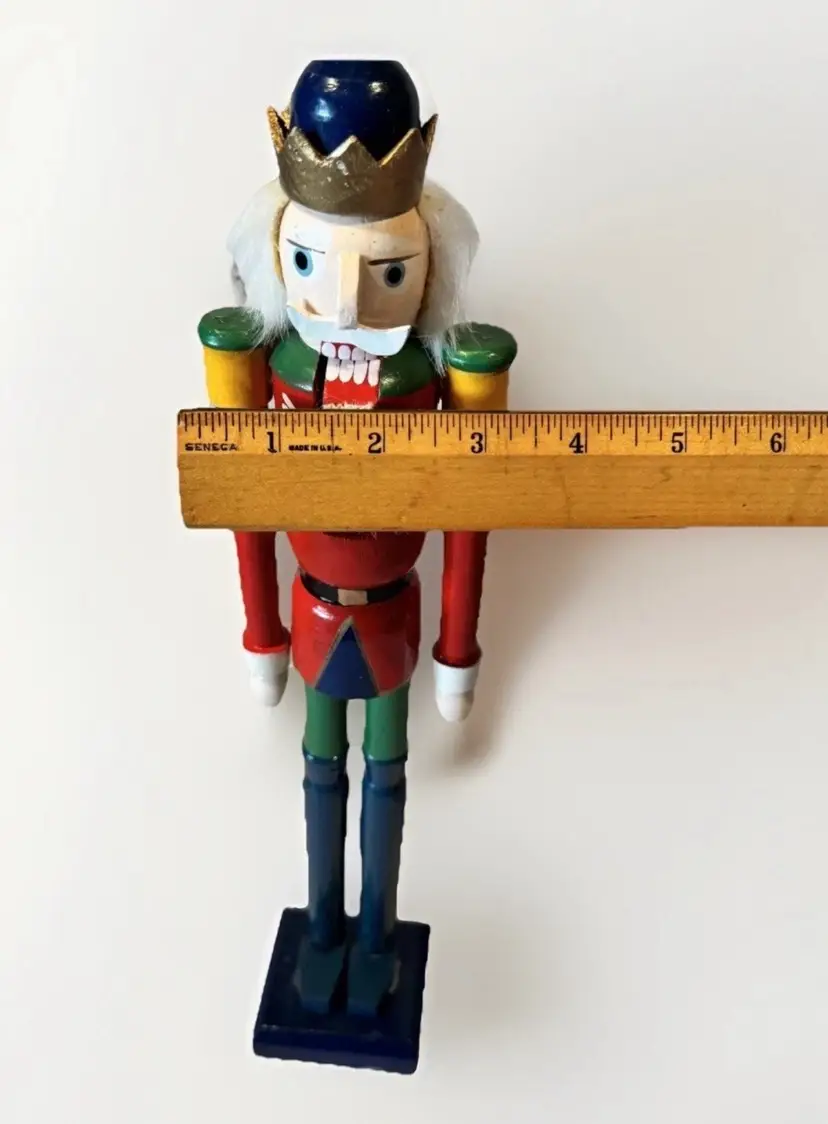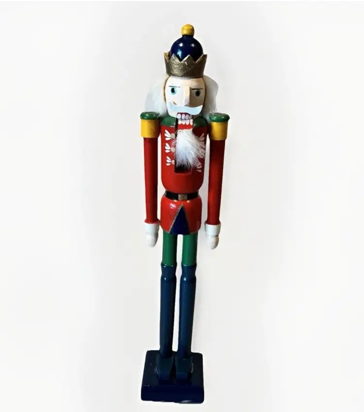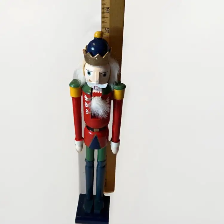 Pre-owned Condition: Great used condition. Minor cosmetic wear on painted surface and base. No broken or missing parts visible. Please see all the pictures as they are part of the description. Hand painted traditional red, green, and blue colors with white details. Gold and navy crown, faux beard, and painted facial features. Stands approximately 15 inches tall and about 3.5 inches wide at shoulders. Weight: 8.2 oz. Sturdy wooden construction with square base. Classic holiday and Christmas decor piece, ideal for shelves, mantels, or display. Timeless collectible toy or festive gift, ready to enhance your seasonal decorations.
