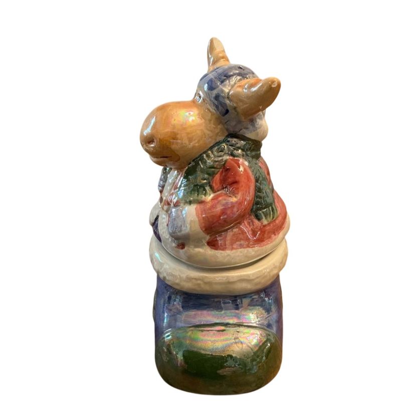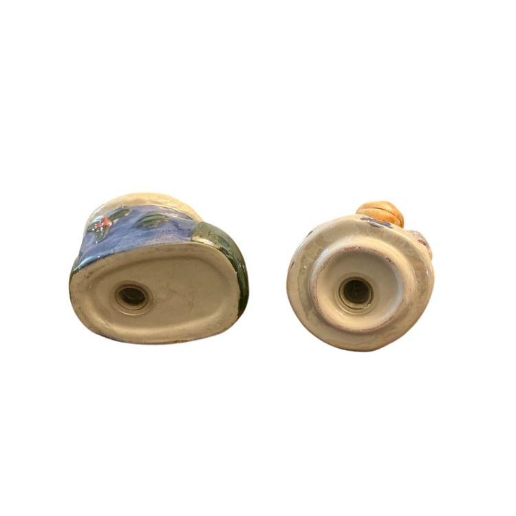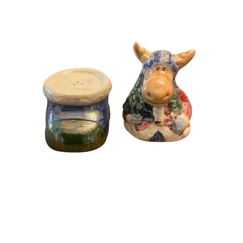 Adorable stackable ceramic salt and pepper shakers. Beautiful iridescent glaze. These stand 5” high when stacked together and 3 1/2” wide. Both have their original stoppers.