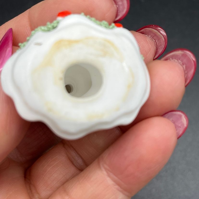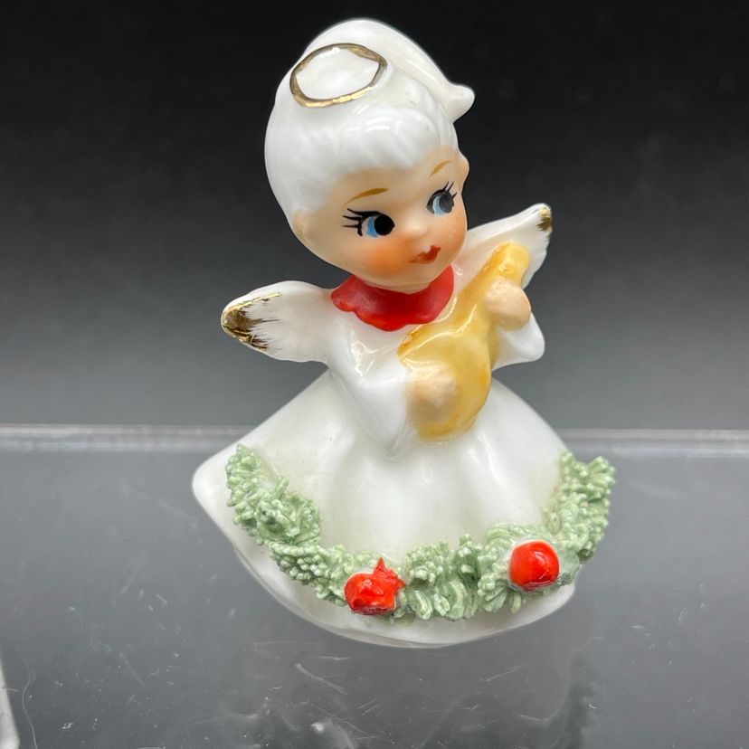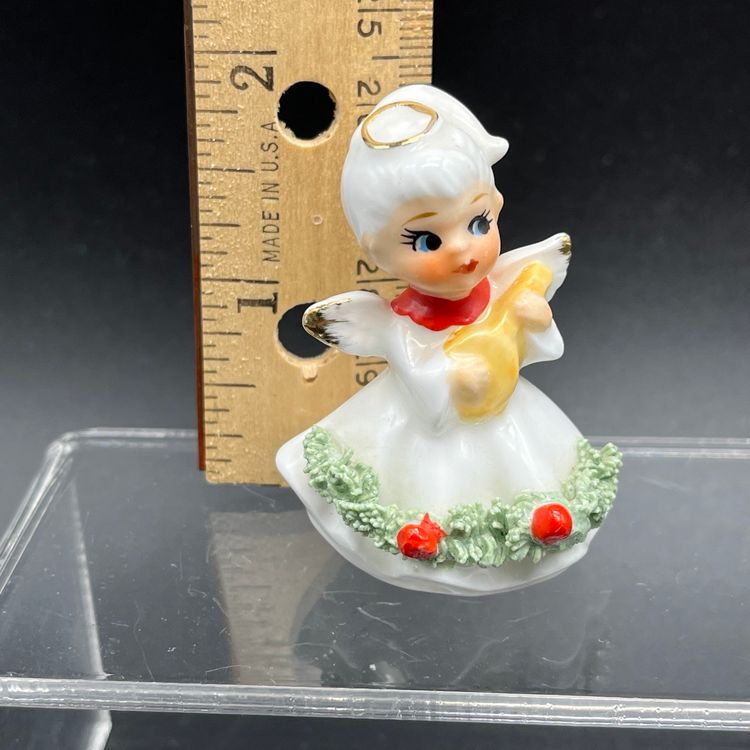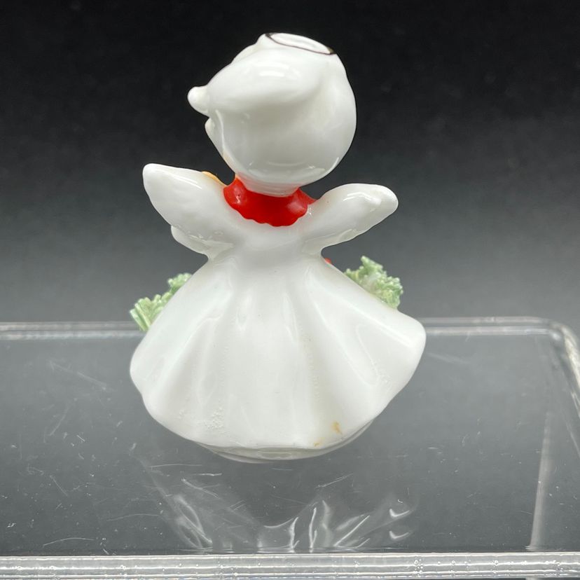 No damage to this little Christmas angel 2 inches tall made in Japan with spaghetti Holly and red berries.