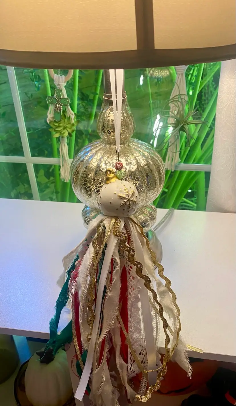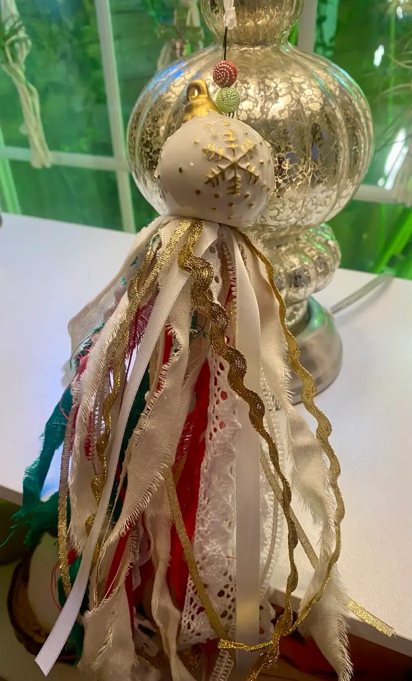 Upcycled ceramic salt shaker using fabric strips, ribbon, crochet trim and beads. Approx 16 inches