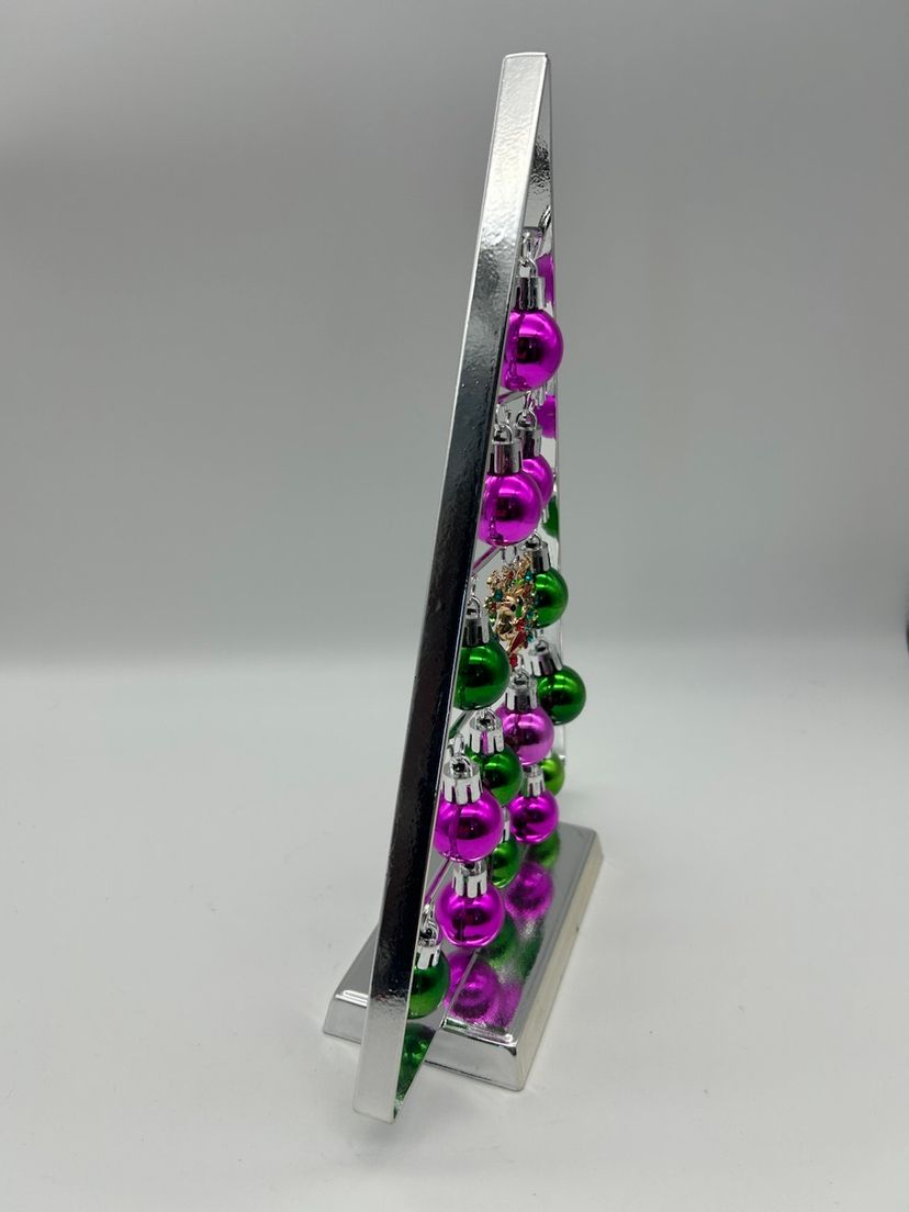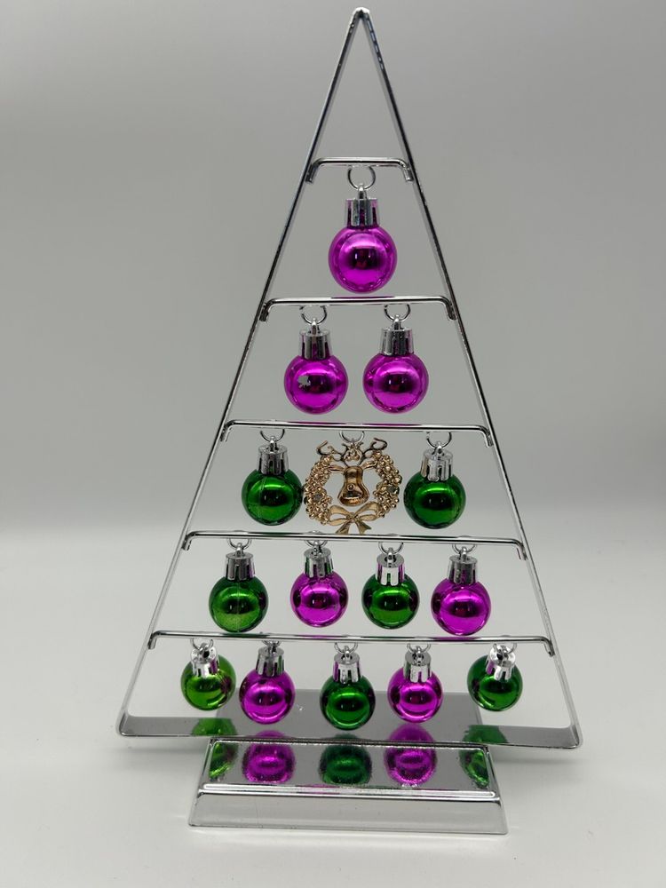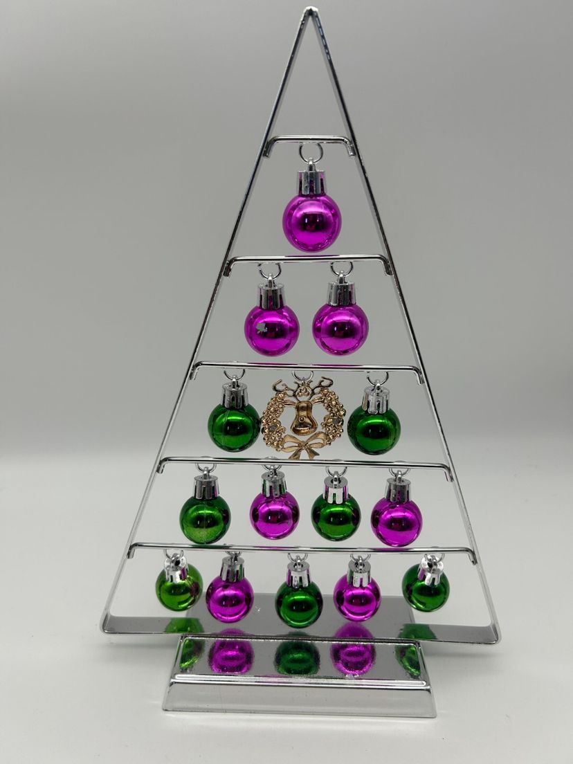 Small decorative metal Christmas tree with ornaments. I picked this up thrifting and it was missing an ornament so I rearranged the original ornament and left a hole in the middle. I replaced the hole with the reindeer wreath making it one of kind. It is approximately 11 1/2” tall. (BSA#3.5)