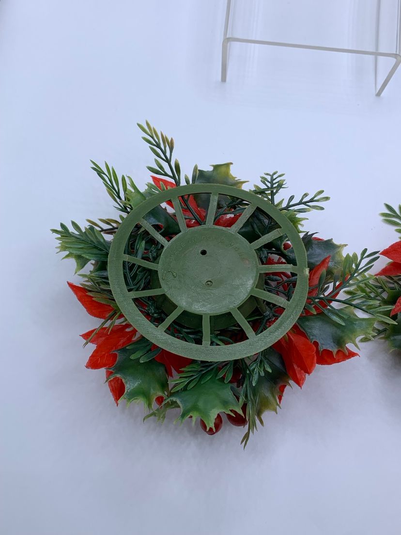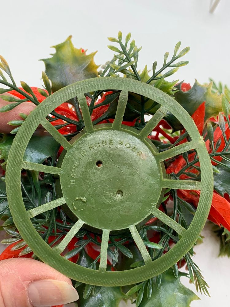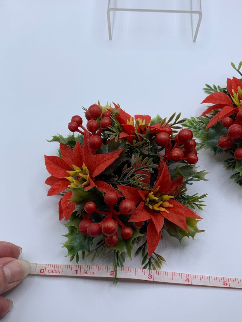 Add a festive touch to your Christmas decorations with these lovely plastic red poinsettia candle holders. These vintage pieces are marked as Made In Hong Kong and are perfect for adding to your collection of holiday decor. The candle holders are unscented and feature a beautiful poinsettia design, making them an ideal addition to your holiday table or mantle. These candle holders are perfect for any occasion and are sure to add a touch of elegance to your Christmas decor. Each ring measures 4 inches in diameter.