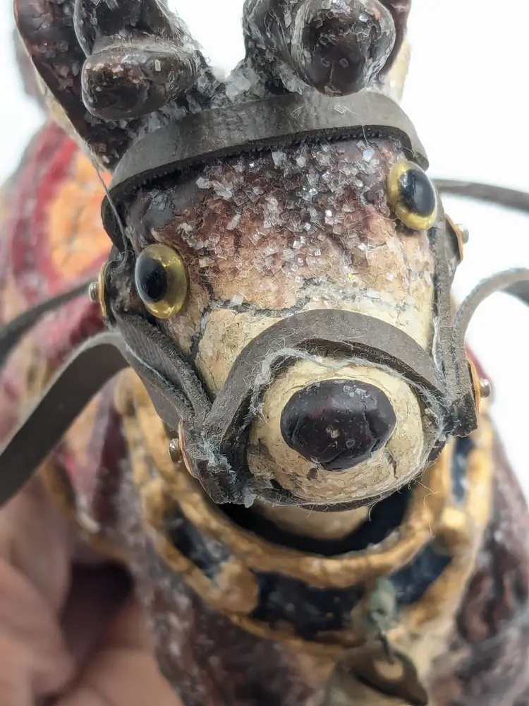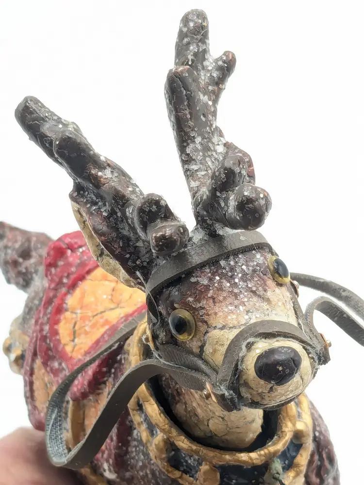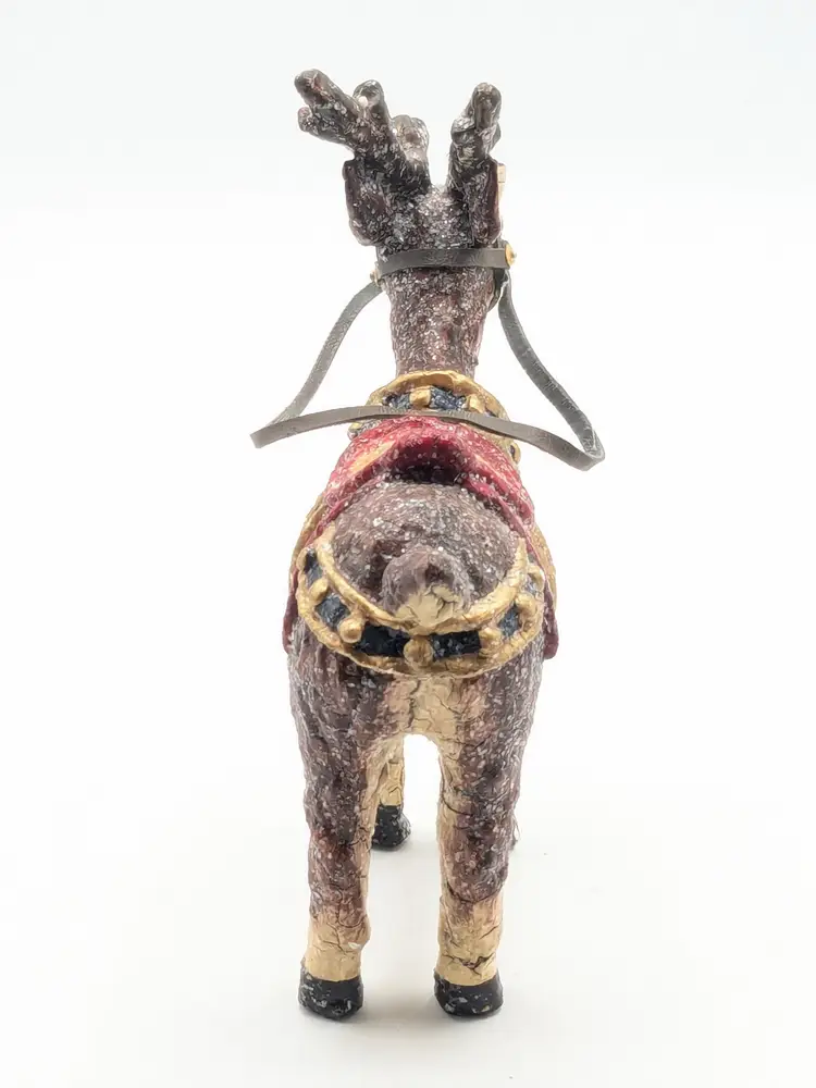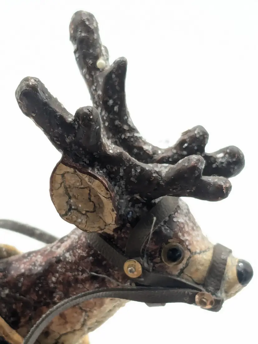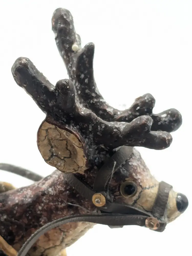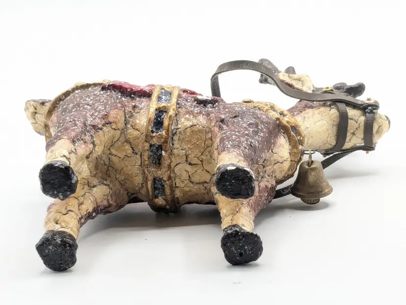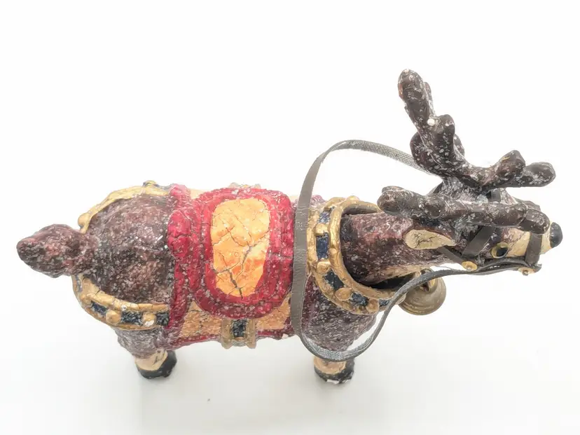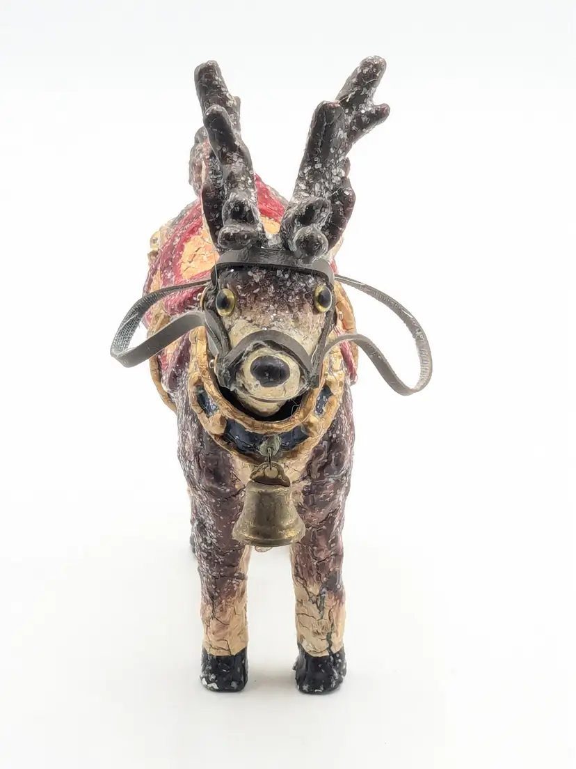 Good condition with 2 small areas of paint loss on hoof and side of belly. Depicted in the last two photos. Nothing a marker wouldn't fix. Ceramic reindeer with a bobble head and sporting a bell. Measures 6 1/8" in height, length 6" and 2" wide. ENS