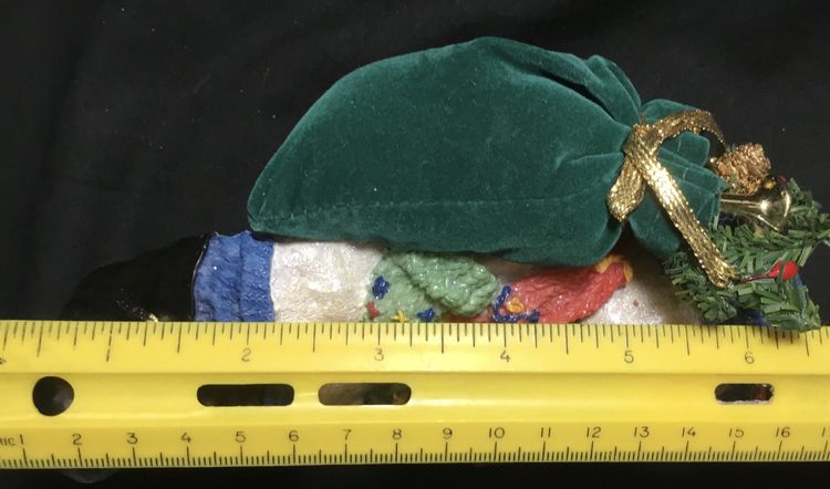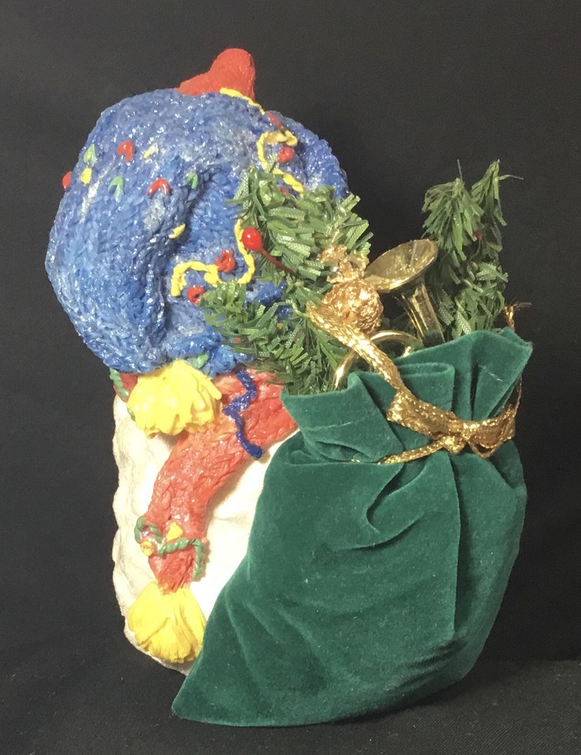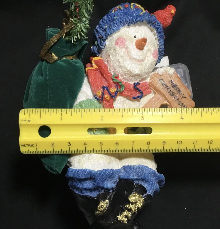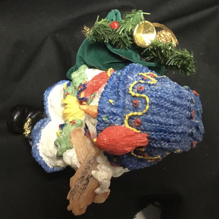 Polystone is resin mixed with powdered stone. Snowman wears blue knitted, long-tailed stocking cap with red, yellow, green flowers, yellow swirls & yellow tassel. Also wears plain blue knitted socks. Black boots with gold ties. Red knitted scarf with blue, yellow, green swirls & yellow tassels. Green knitted mittens with red, yellow, blue Xs on them. He carries a wood-look sign that says "Merry Christmas" in black lettering . All these details are in polystone with glitter all over. By his side is a green velvet (actual fabric) gift bag with gold cord and Christmas branches and toys sticking out of the top. His legs are molded in a bent position so he can sit on a shelf with his legs hanging down from the kneess. See all photos.