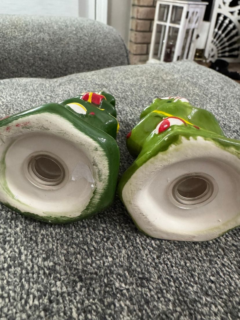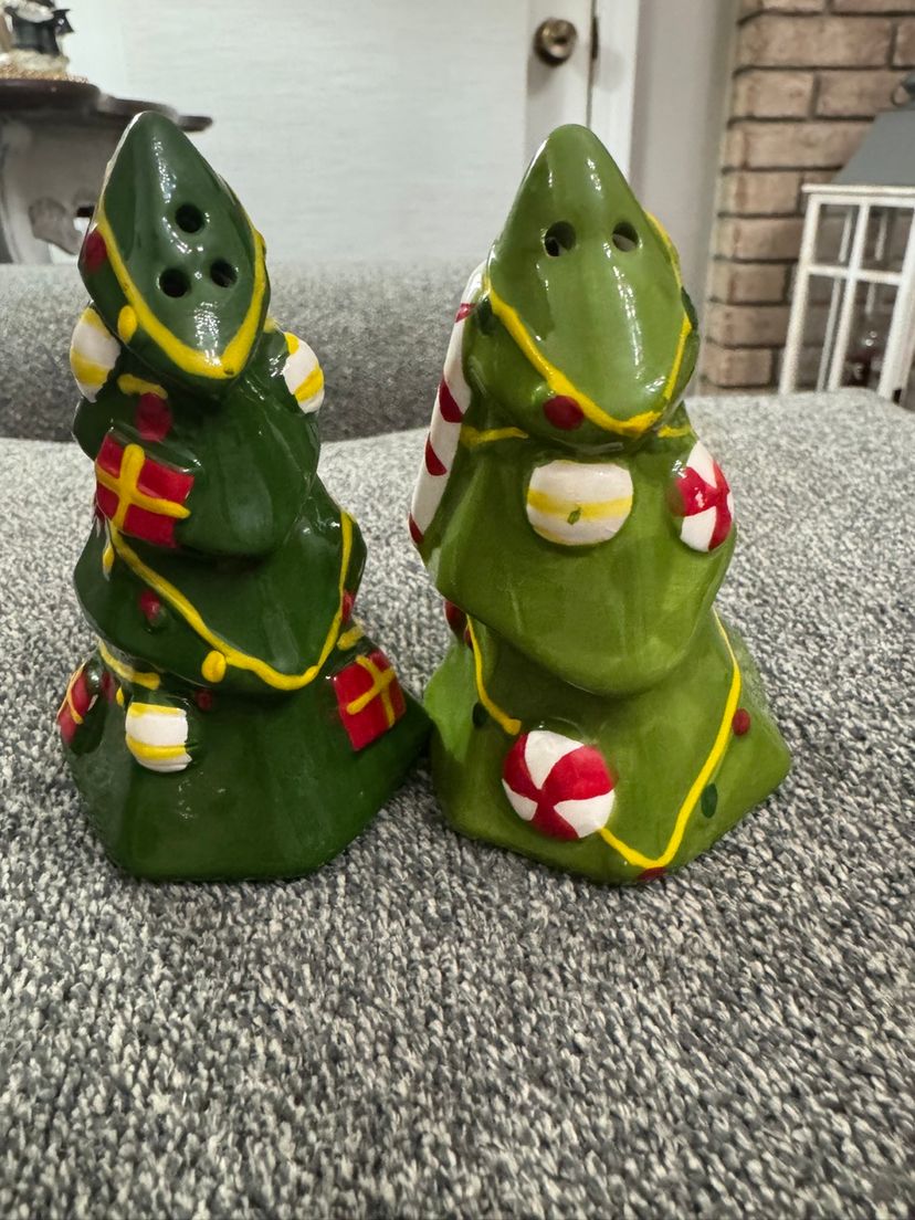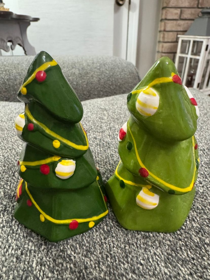 These Christmas Tree salt & pepper shakers are decorated with a festive design, including painted ornaments, garlands, & a candy cane on one of the trees. A perfect addition to your Christmas table or decor, or a cute gift to add in a kitchen gift basket with a cookbook of your choice.