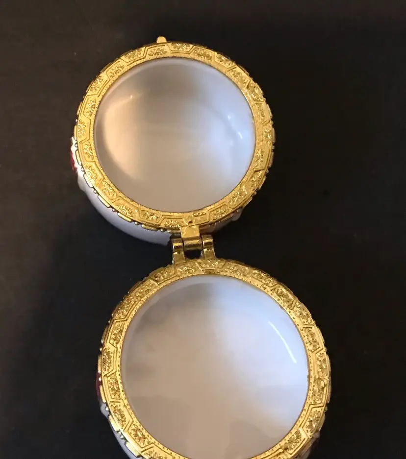 This is a present themed ceramic hinged trinket box in a round shape. The box is hand-painted with a big bow present pattern in white and red colors. It is suitable for storing jewelry and is designed for teens, adults, girls, and kids. The box features a glossy finish, snap closure, and is easy to clean with a damp cloth. Perfect for any room