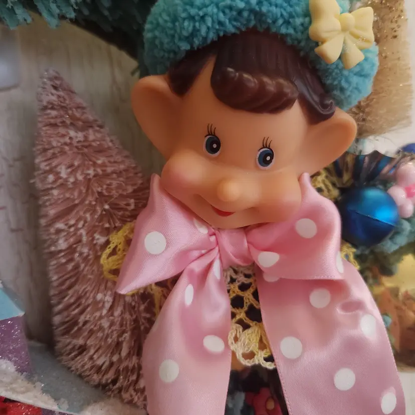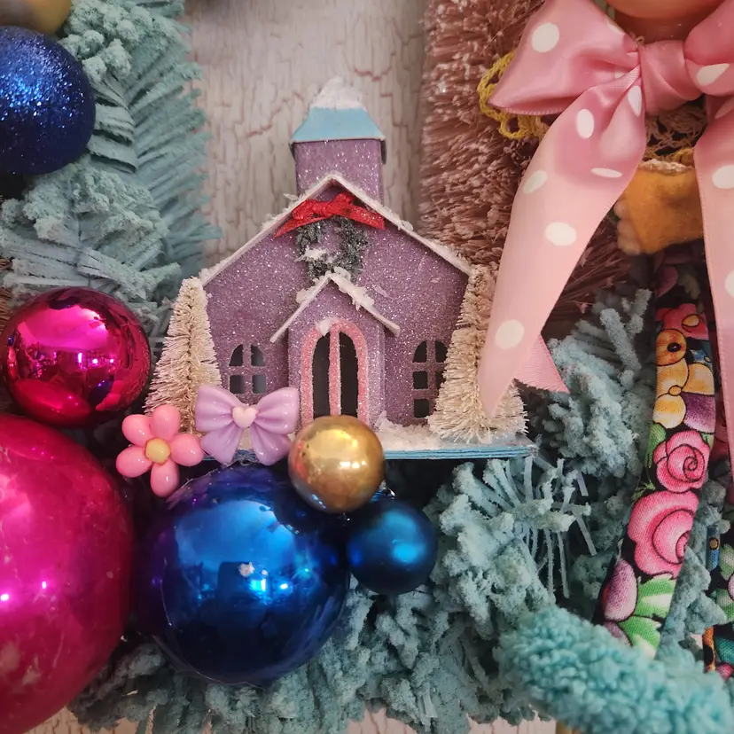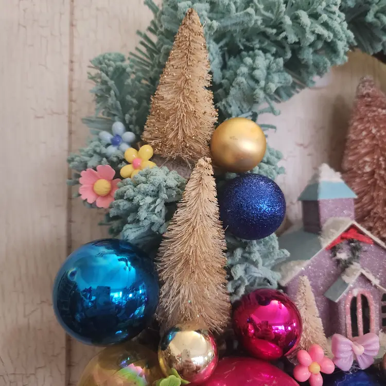 Vintage inspired teal flocked wreath. A handmade knee hugger made from vintage Mary Englebright floral fabric and a yellow crochet doily sit perched next to a whimsical Putz house. There are several bottlebrush trees and vintage ornaments as well. Such a sweet way to decorate for the holidays. Measures 10 inches plus.