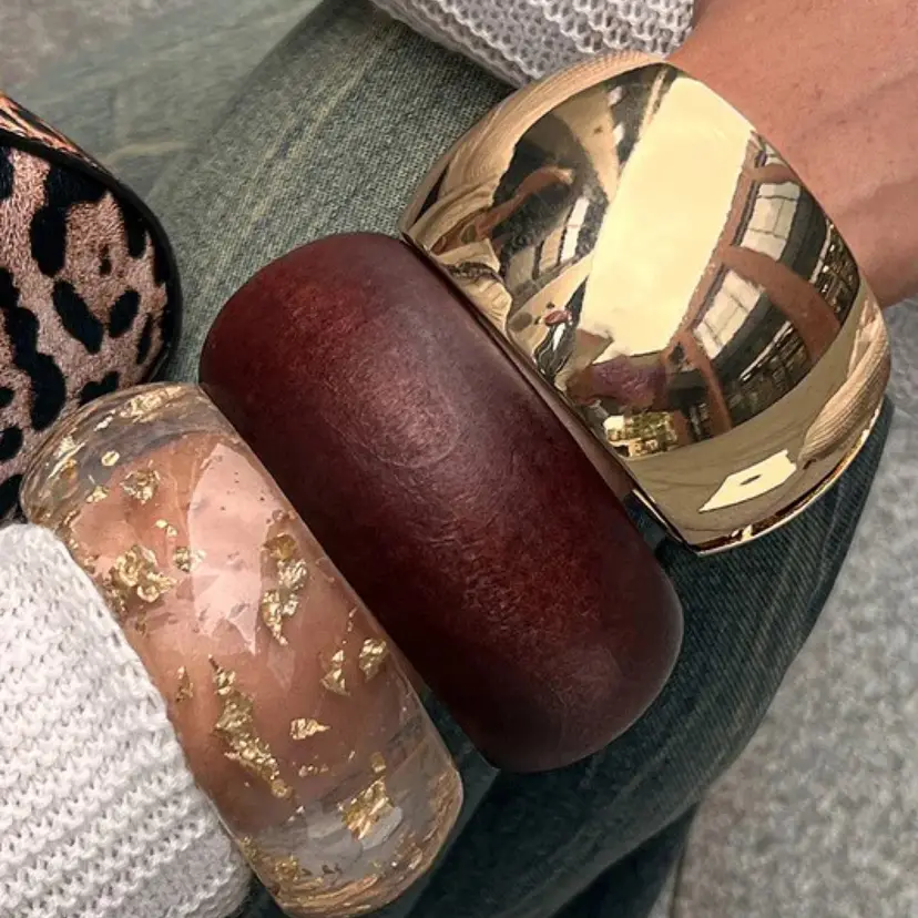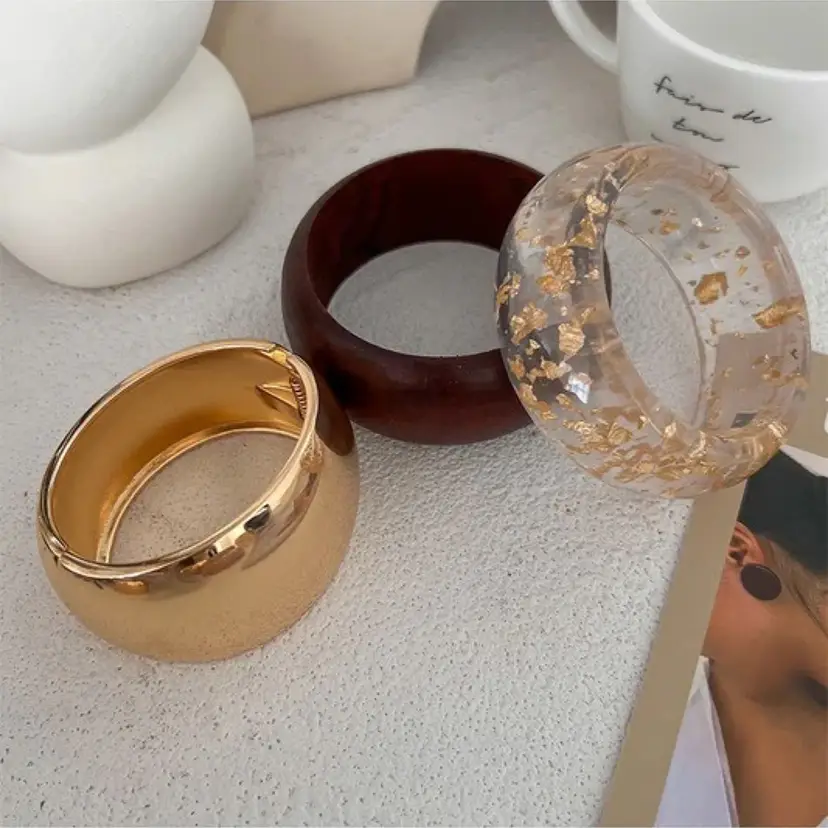 Set of 3 bangles: Gold-plated metal, polished wood, and clear resin with gold foil Chunky, wide-band construction for maximum impact Smooth, slip-on fit (no clasp) Lightweight yet bold—perfect for all-day wear Why You’ll Love It: