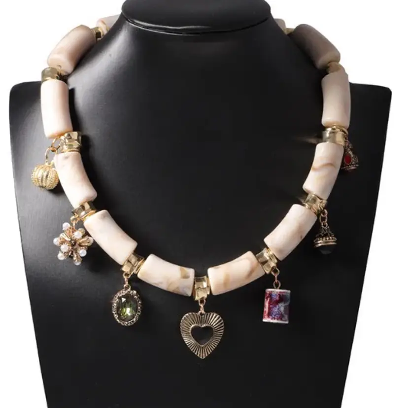 Bold and full of personality, this chunky resin necklace blends creamy bamboo-inspired segments with a playful mix of charms and gold detailing. Each charm brings its own flair—from hearts to florals to vintage vibes—creating a one-of-a-kind statement piece that adds instant interest to any look.