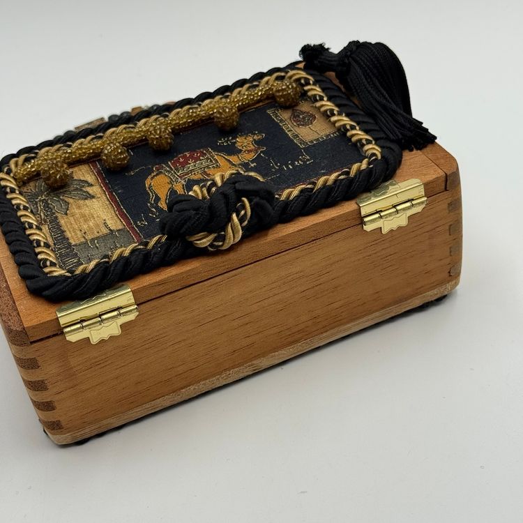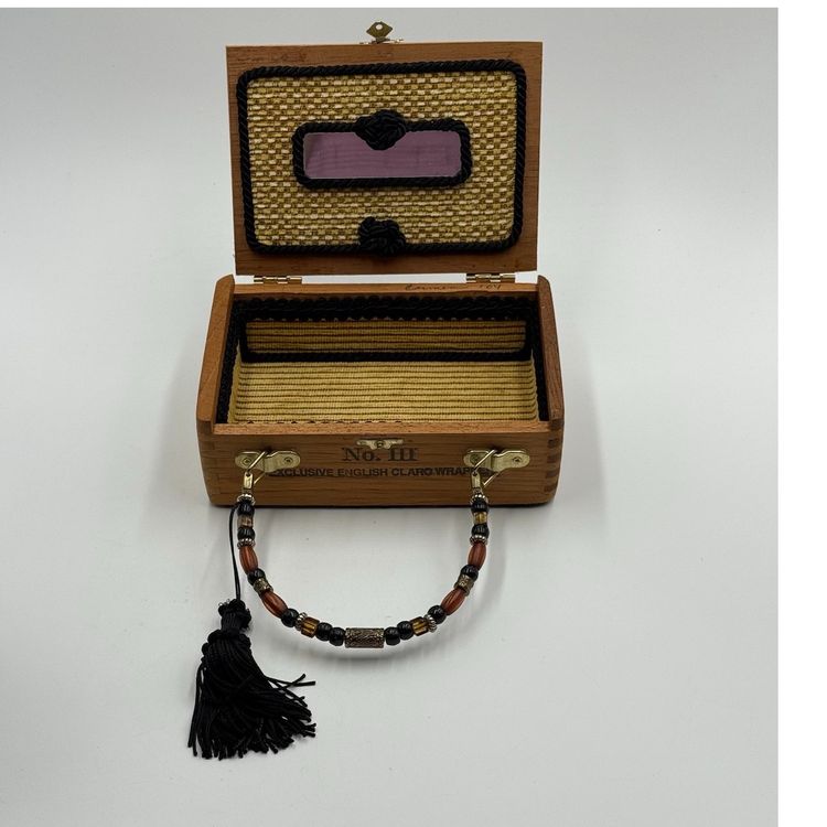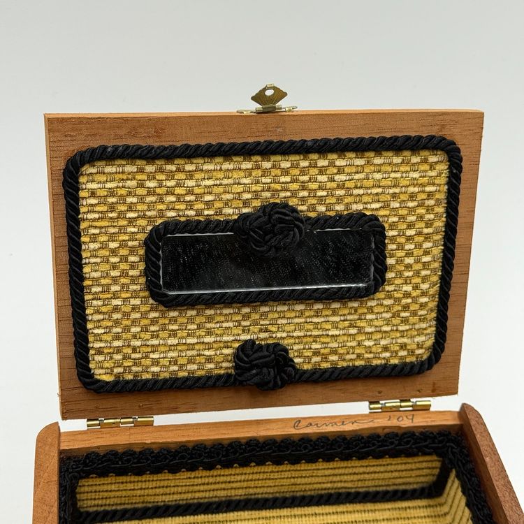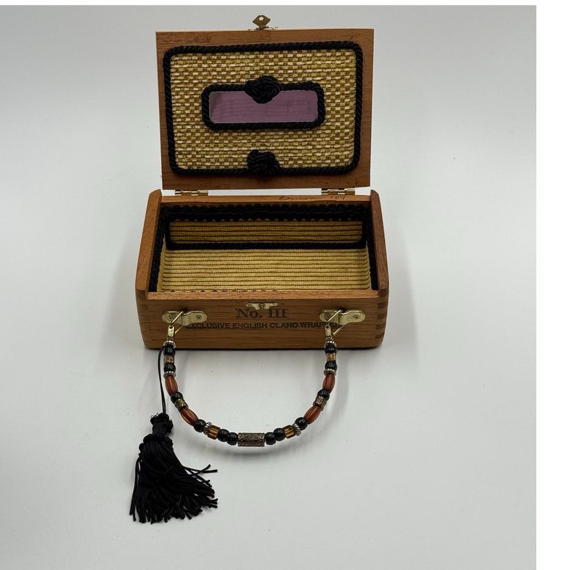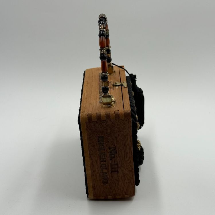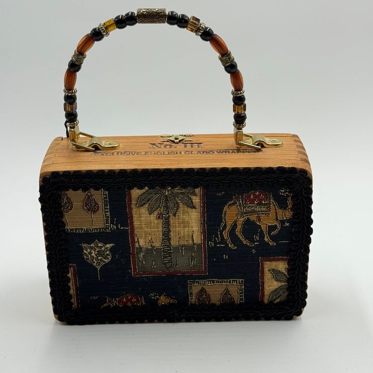 In good condition. There is a small chip by the clasp. The clasp has some glue reside on it. Has a beaded handle and black accent tassel. The inside of the purse is lined with yellow and black fabric with a mirror attached to the inside of the lid. The box is wooden with finger joints. Measures 4 1/2 inches tall without the handle; 6 3/4 inches long and 2 1/4 inches wide.
