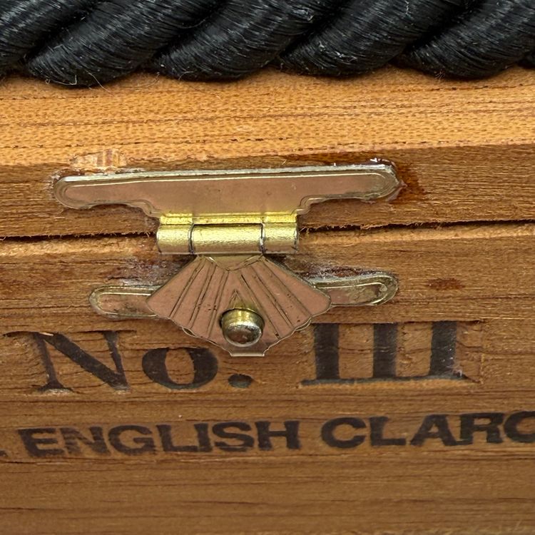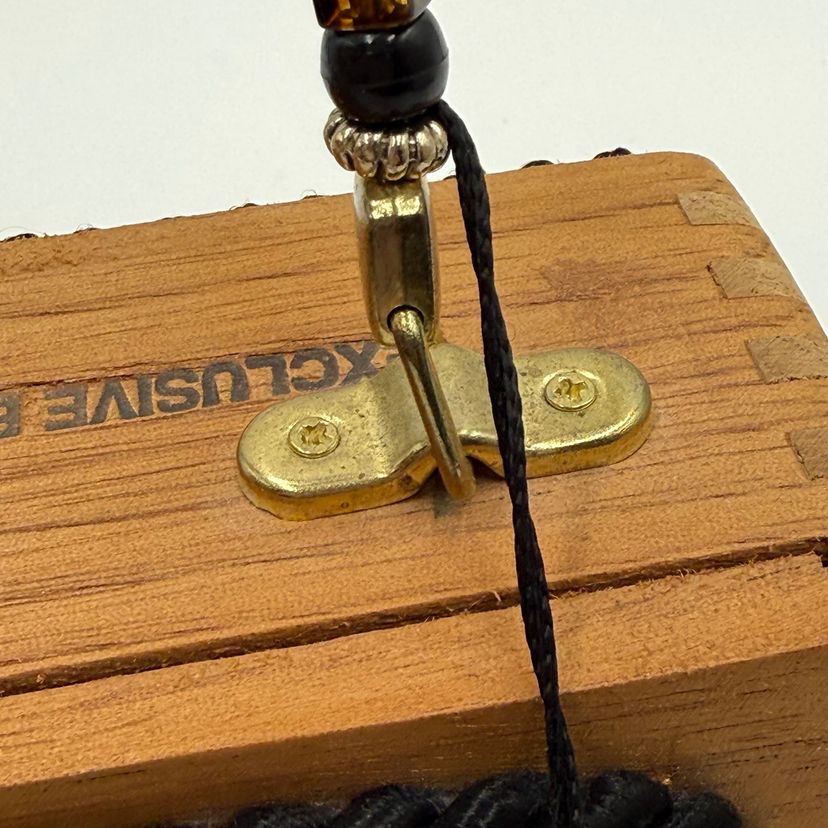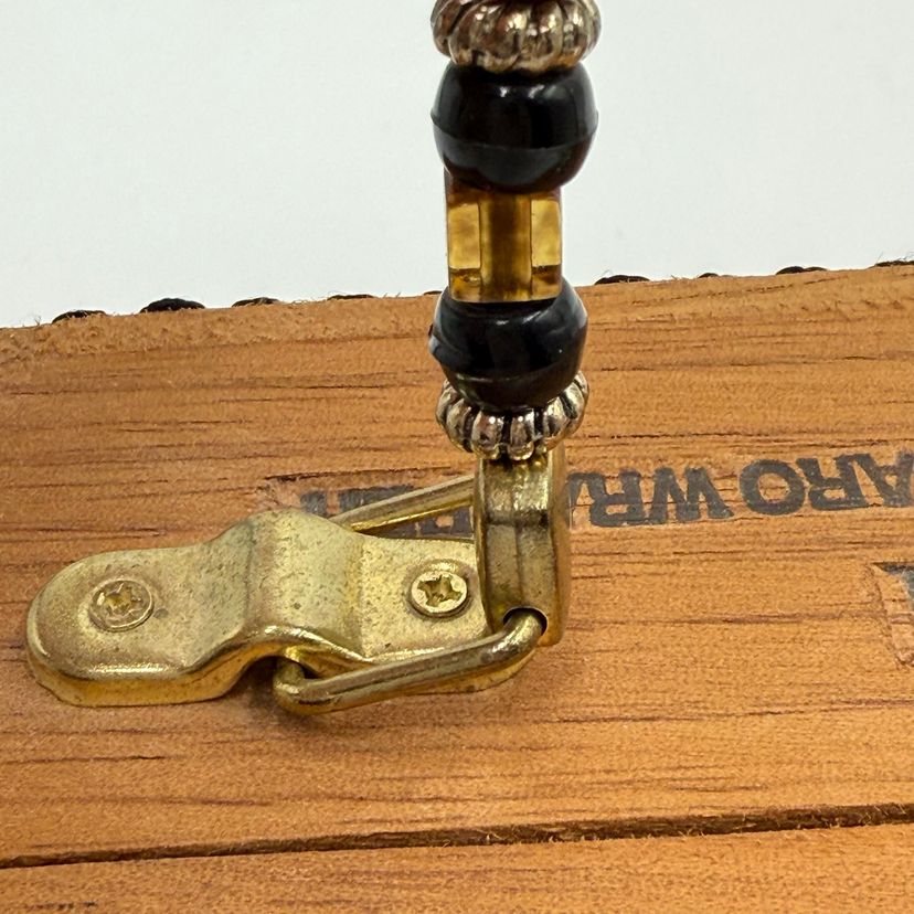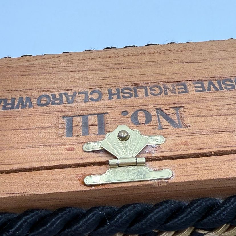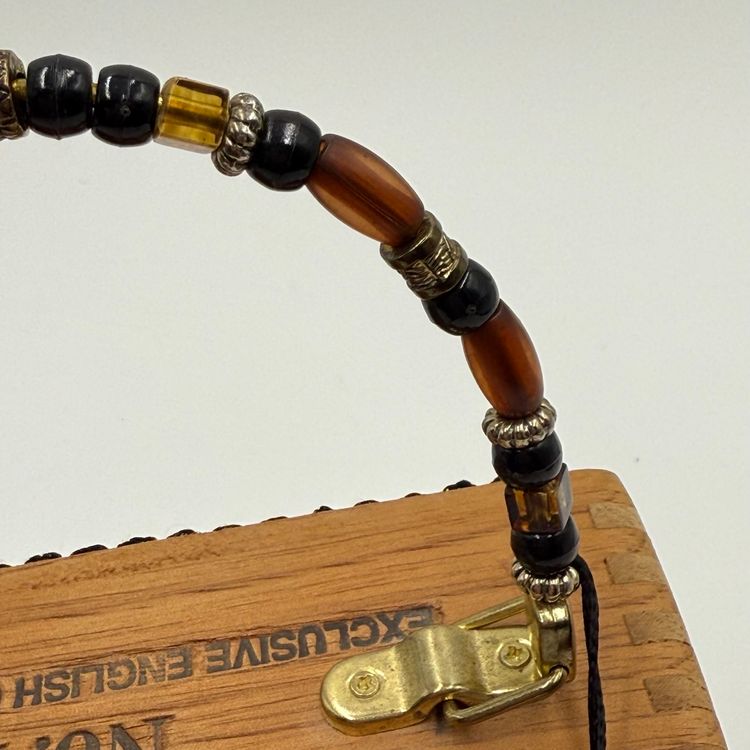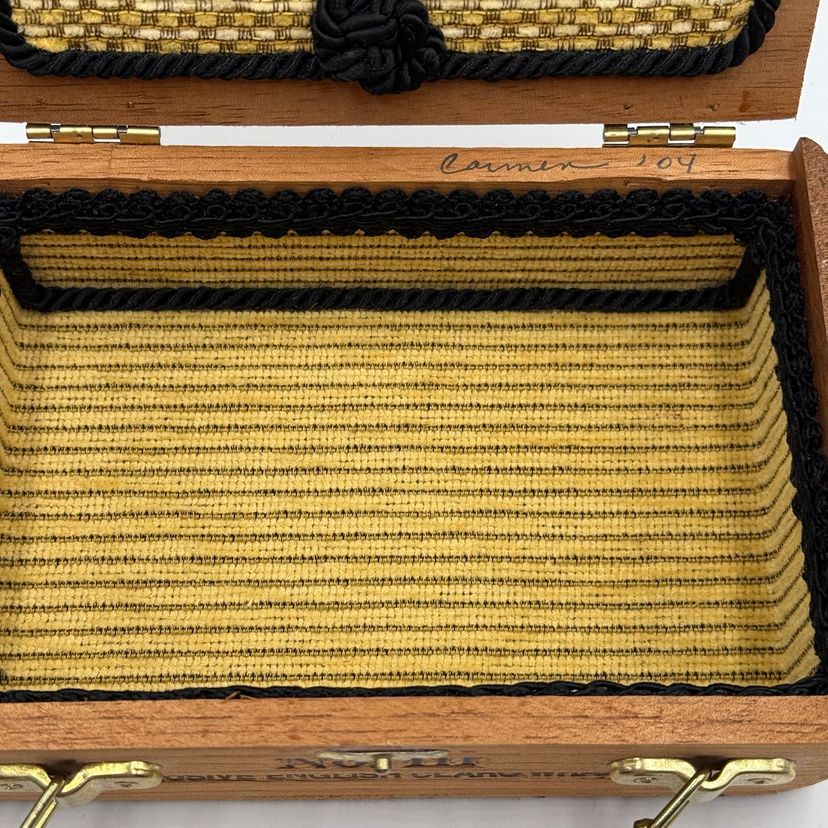 In good condition. There is a small chip by the clasp. The clasp has some glue reside on it. Has a beaded handle and black accent tassel. The inside of the purse is lined with yellow and black fabric with a mirror attached to the inside of the lid. The box is wooden with finger joints. Measures 4 1/2 inches tall without the handle; 6 3/4 inches long and 2 1/4 inches wide.