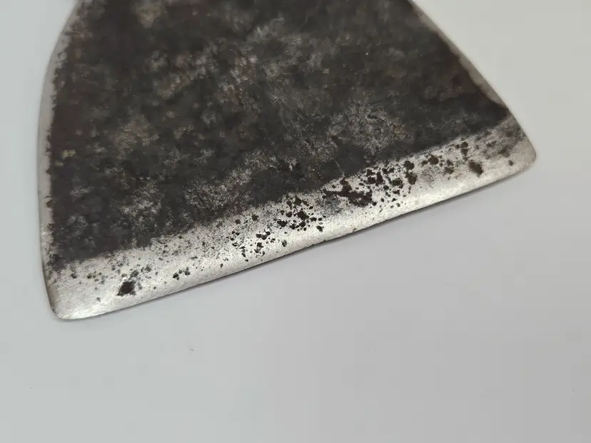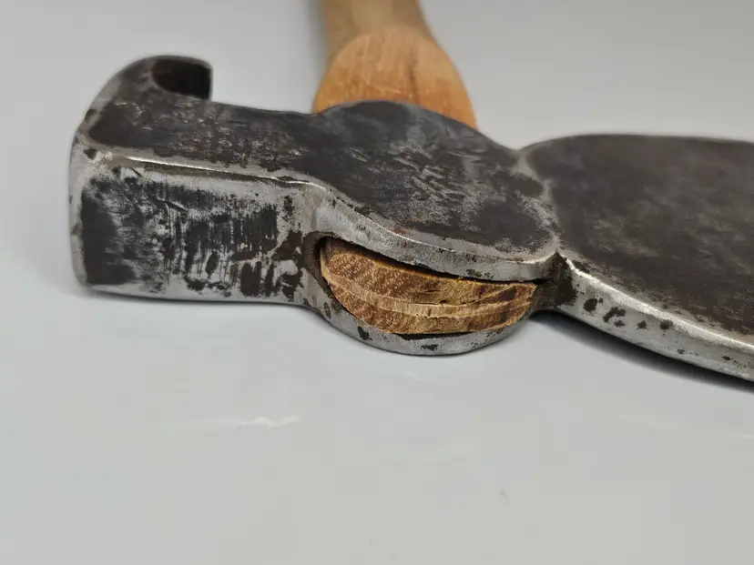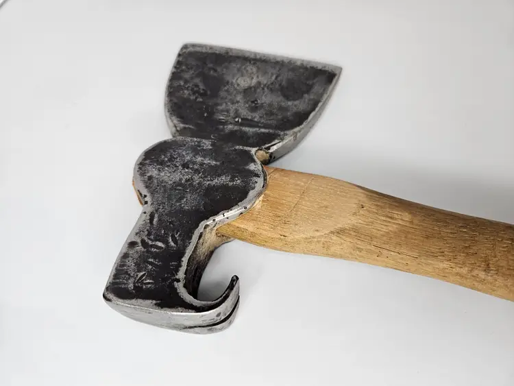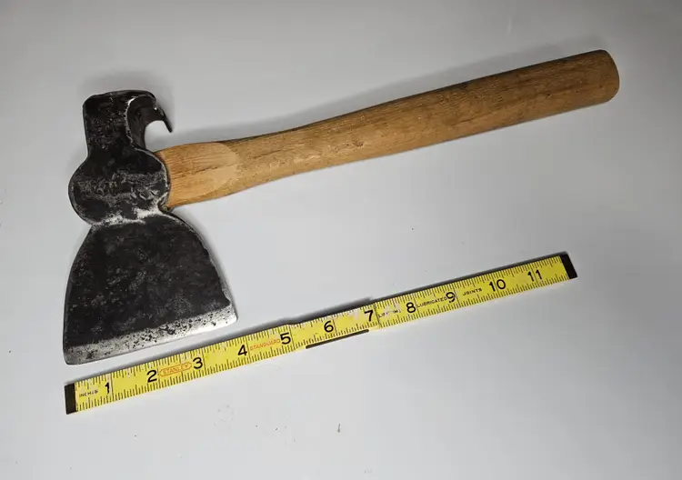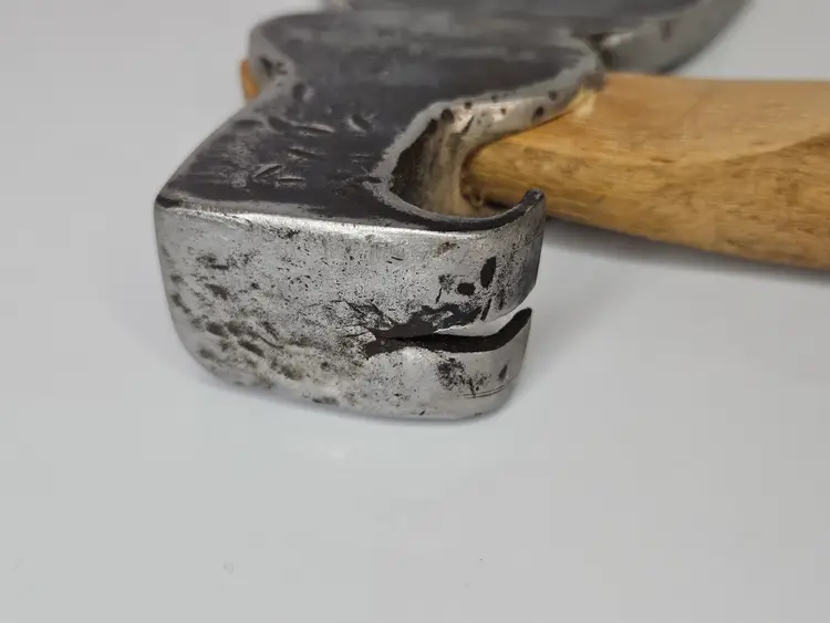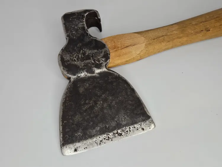 Unmarked claw hatchet with new handle. Replacement handle is well made and fits tightly to the head. Head weighs 2lb / 32oz. No offset to this hatchet like a hewing axe.