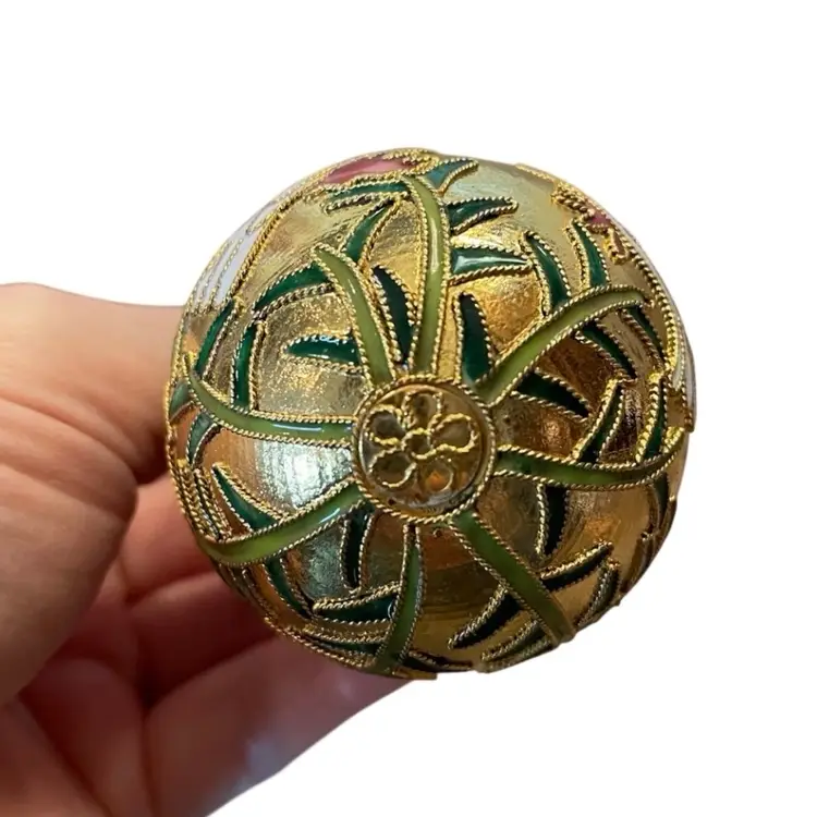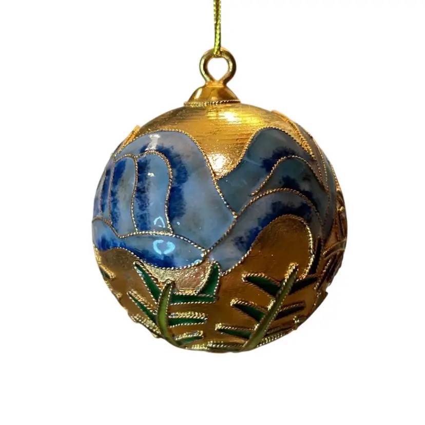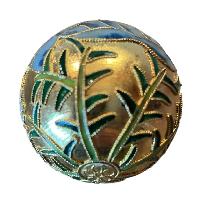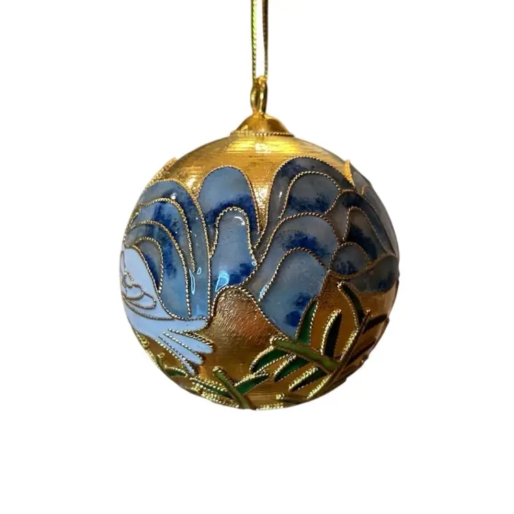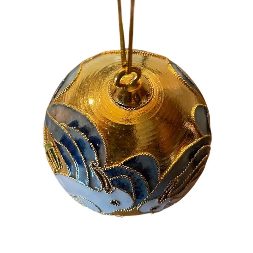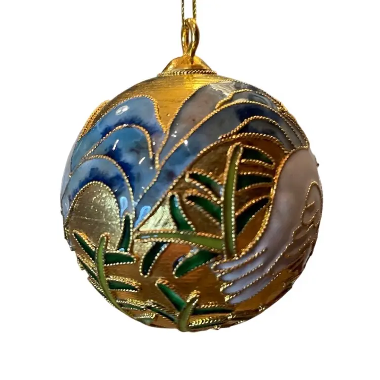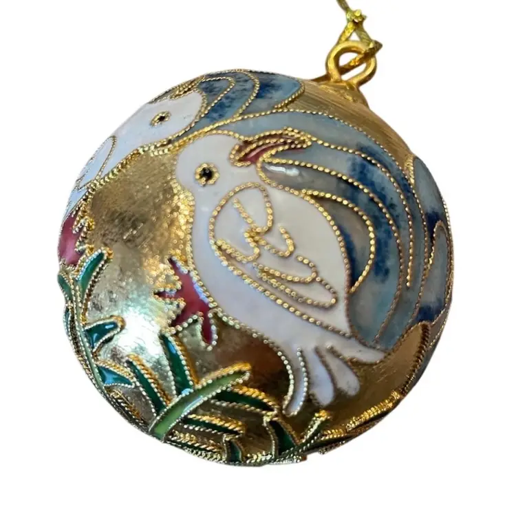 This is a vintage cloisonne hanging ornament featuring two white birds. Measures approximately 2" in diameter. No major flaws.