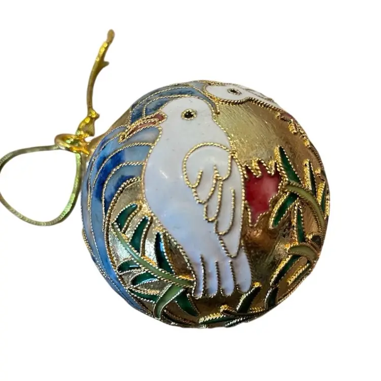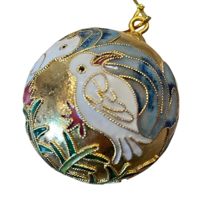 Cloisonne Hanging Ornament with Two White Birds Doves Vintage Christmas