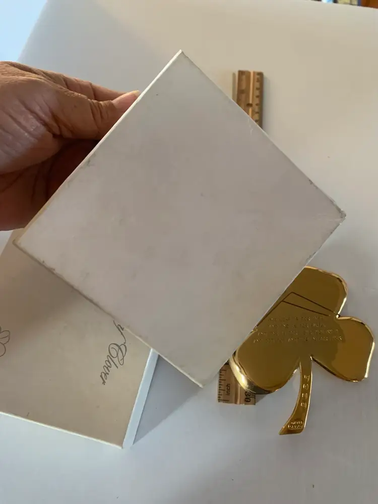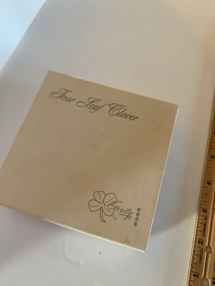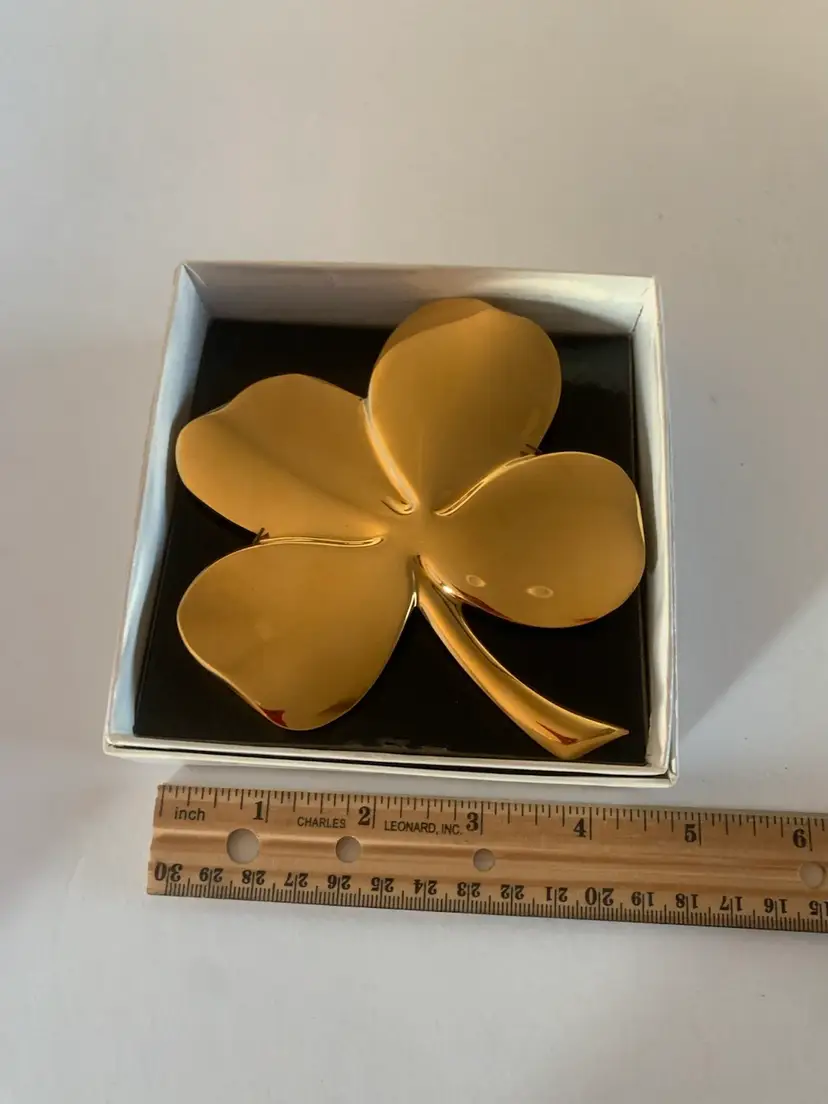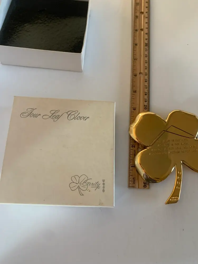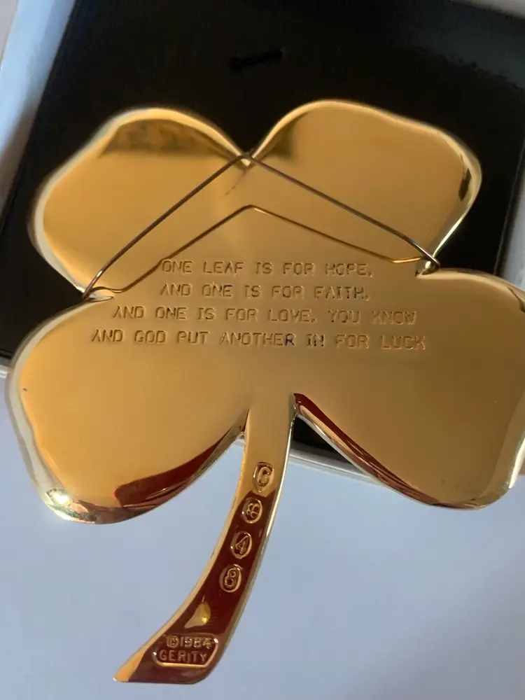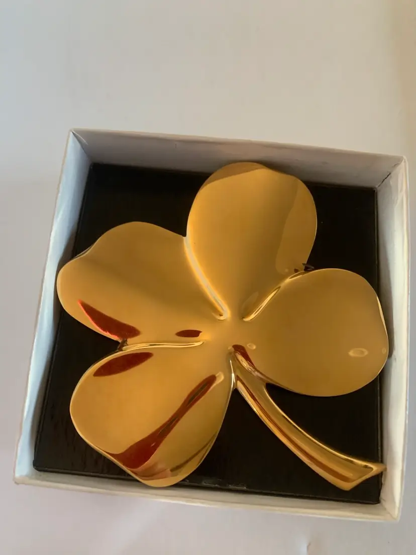 This Gerity clover is a polished gold-tone four-leaf clover, elegantly shaped with smooth, rounded leaves and a sleek stem. Presented in a black and white gift box, it exudes a refined, classic look. Symbolizing good luck and prosperity, the clover’s simple yet radiant design makes it a timeless decorative keepsake or meaningful gift.