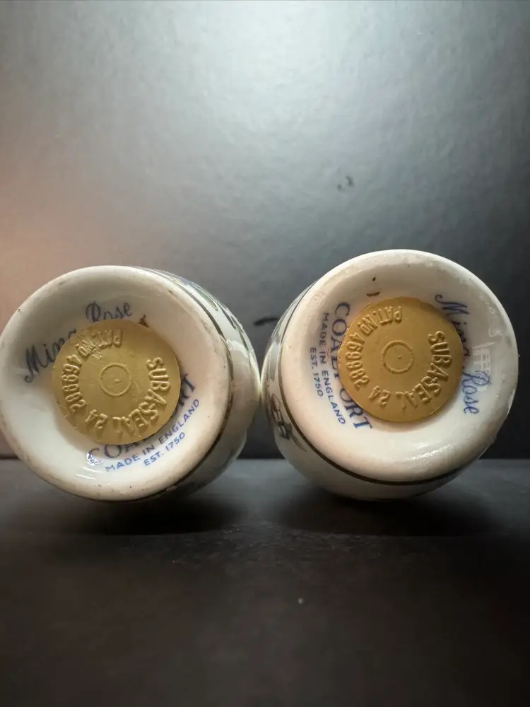 Charming Salt and Pepper Shaker Set by Coalport – England Ming Rose Porcelain shakers with ping, green, blue, and yellow flowers Yellow with green trim around the center and gold trim at the bottom The pepper shaker has 1 hole, salt shaker has 13 holes This is a retired pattern; it was made from 1970 to 1993. 1.5x3” Like new condition.