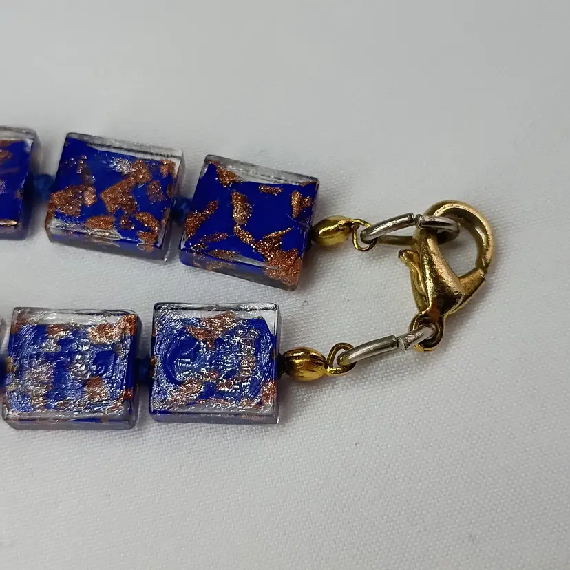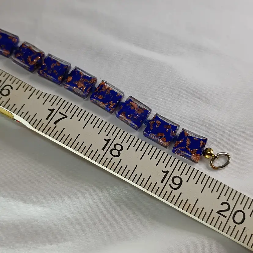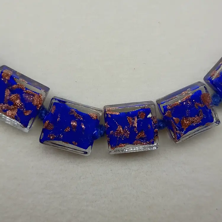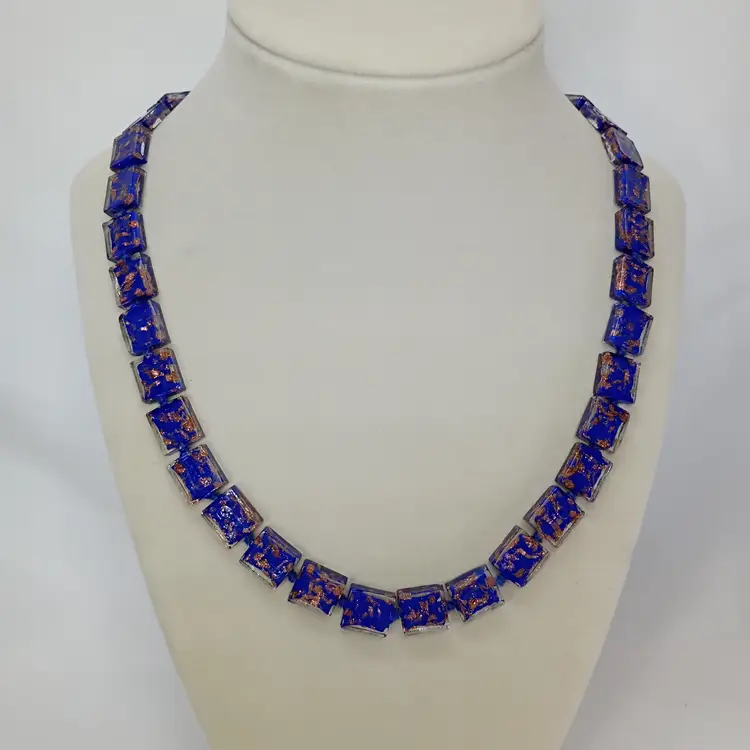 Beautiful cobalt blue art glass necklace featuring square glass beads infused with shimmering gold foil accents. Each handcrafted bead displays a captivating mix of blue and gold tones encased in clear glass, giving the piece depth and sparkle. The necklace measures approximately 19.5 inches long and closes securely with a lobster clasp that shows minor surface wear. Unmarked and in excellent overall condition with no chipped beads. A stunning and elegant statement piece perfect for collectors or anyone who loves unique vintage glass jewelry.