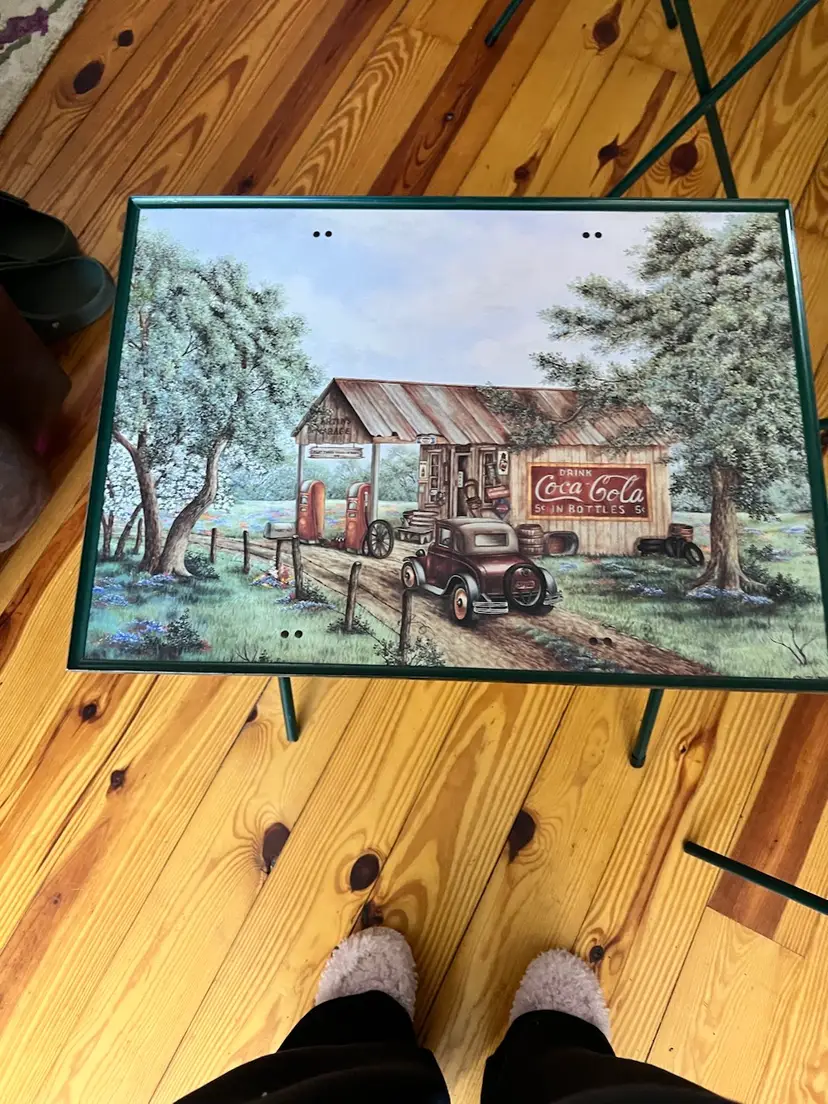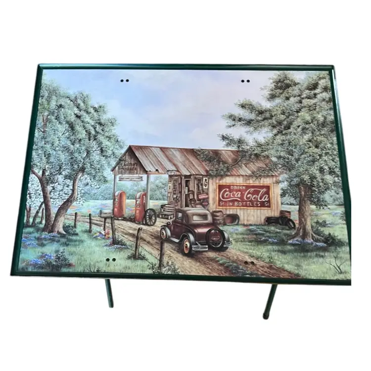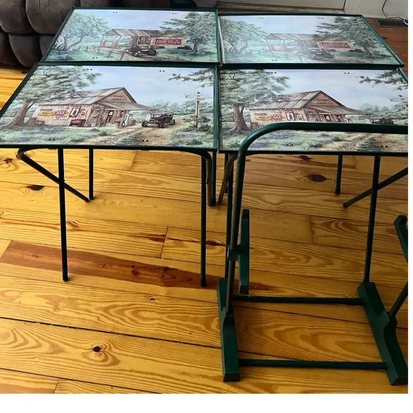COCA COLA TV TRAYS WITH THE STAND A VERY RARE FIND, FEATURING DESIGNS BY MIKE MILLER GARAGE AND KAY LAMB SHANNON. CREATED IN THE 1950’S TO THE 1970’S THEY SHOW A CREATED COLORFUL COCA COLA ADVERTISING WITH THE THEME FIGURED AROUND THE PRODUCT. THESE ARE COLLECTIBLE FOR A COCA COLA COLLECTOR.