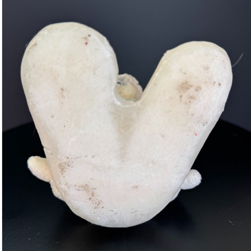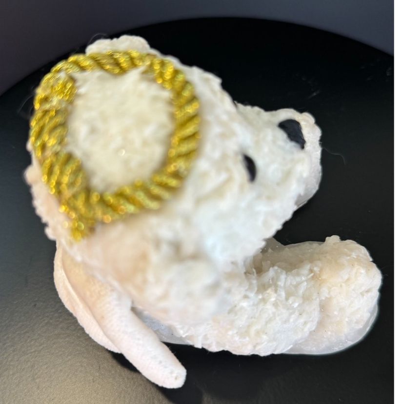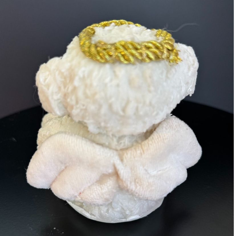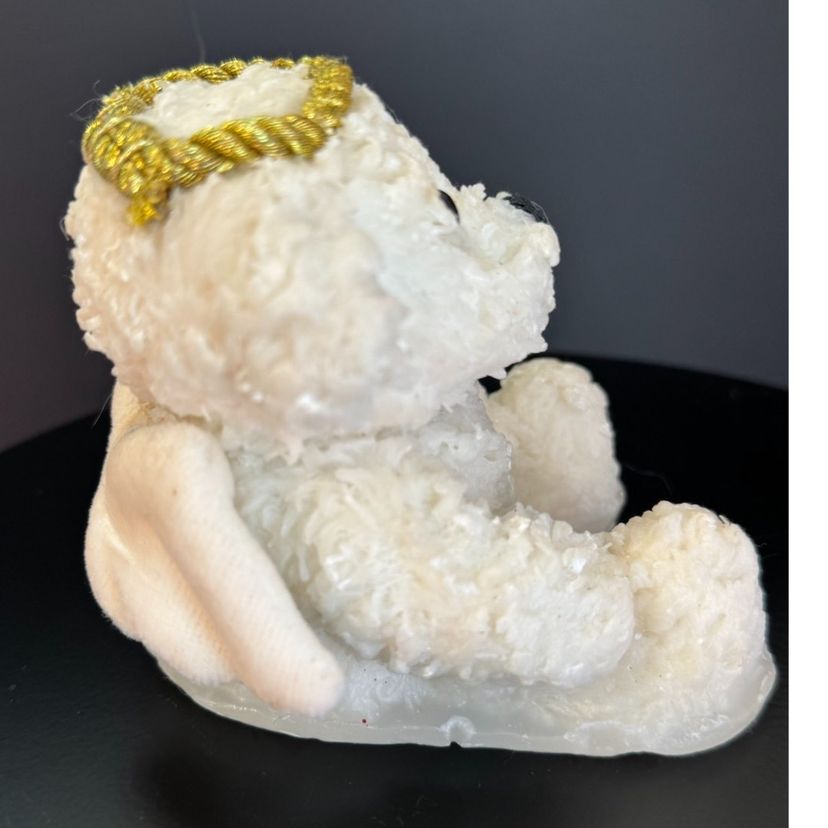 This little bear is so cute! It appears to be made from wax, but I can’t find a wick. The wings are velvet. Great condition and measures about 3 inches tall. Looks like he’s been rolled in coconut.