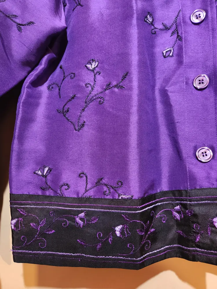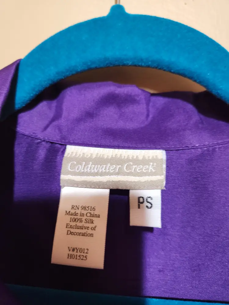 Coldwater Creek Embroidered Silk Button Down Blouse Size Petite Small Colors Main - rich purple with black embroidered vine and purple flowers Trim - bottom of blouse and sleeves - black with purple embroidered vines and flowers 100% silk (not embroidery) Measurements Shoulder to hem is 22 inches Armpit to armpit is 21 inches Can also be used a jacket