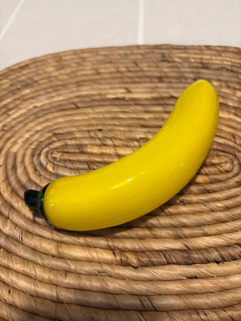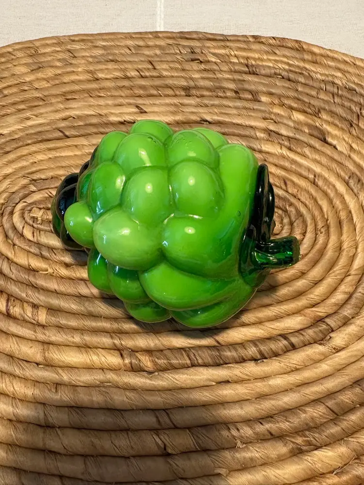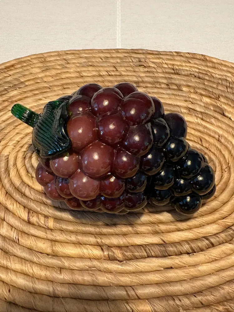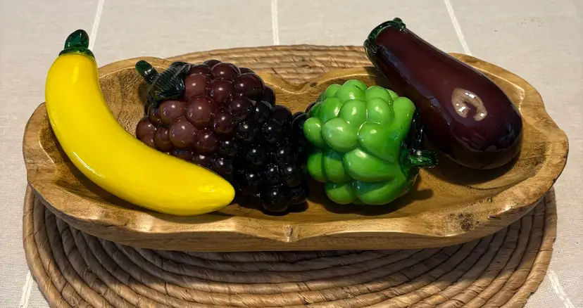 Vintage Murano Style Glass Fruit includes Purple Grapes,green grapes,banana and eggplant with small chip on leaf. Beautiful colors for display.