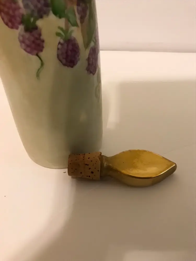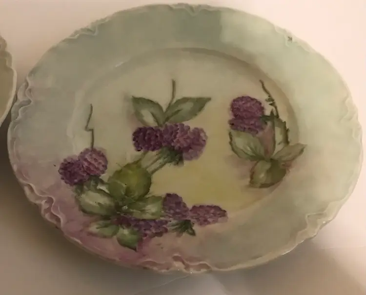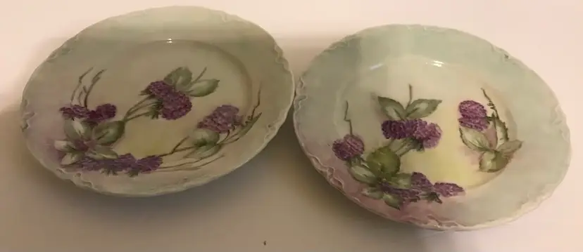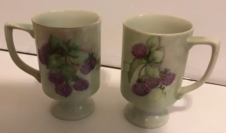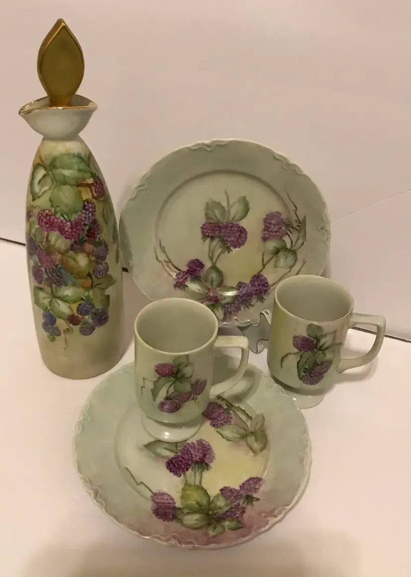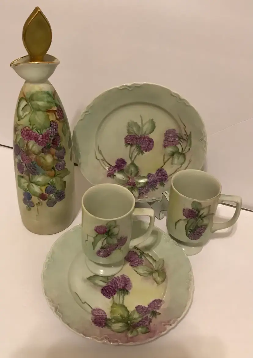 All items are in great condition. No chips or cracks. Decanter has original stopper with cork (fragile) decanter is 14” including stopper x 4” at biggest section. The pedastal mugs are 4.5”x 3.75” and the plates are 8” around. This is beautiful cottage core/shabby chic.
