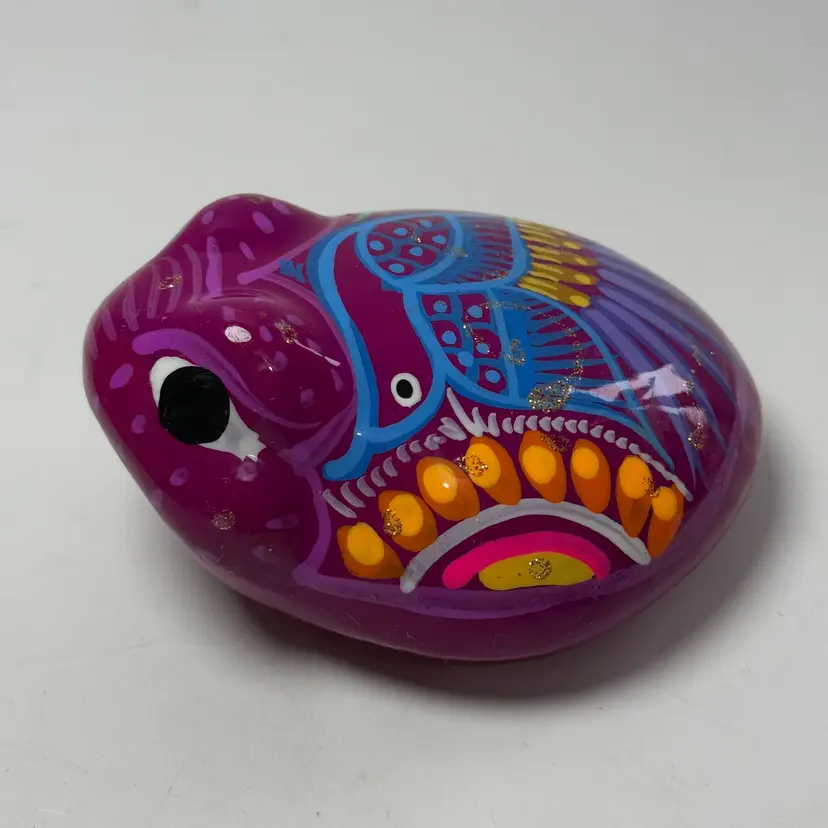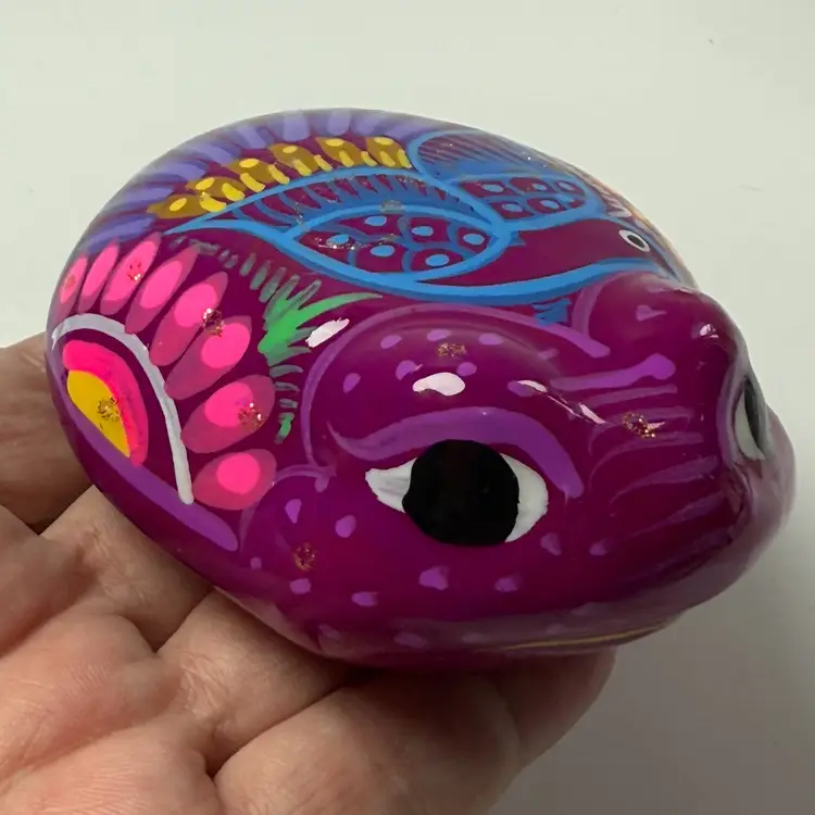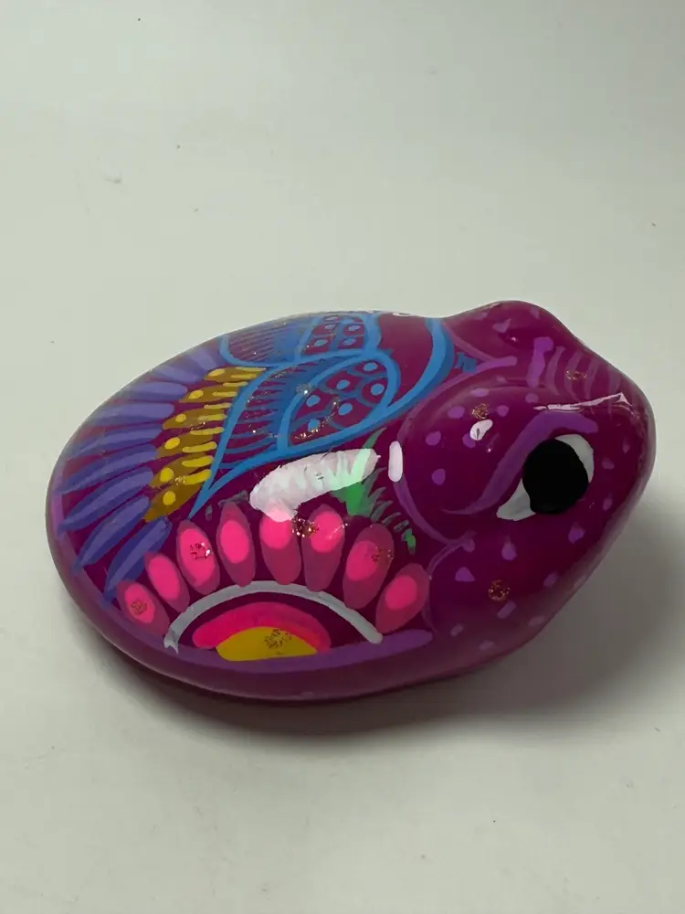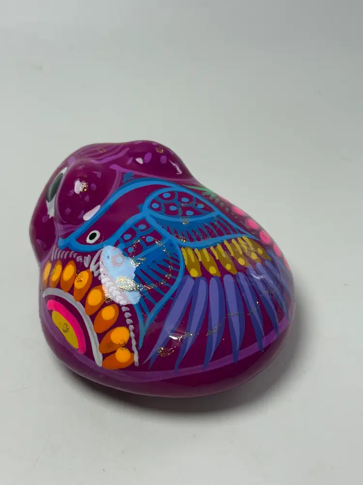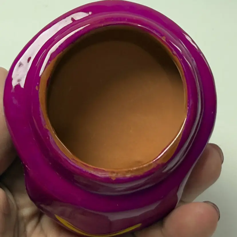 Small chip on inside rim. 2" tall x 4" diameter. Paint glows under black light.