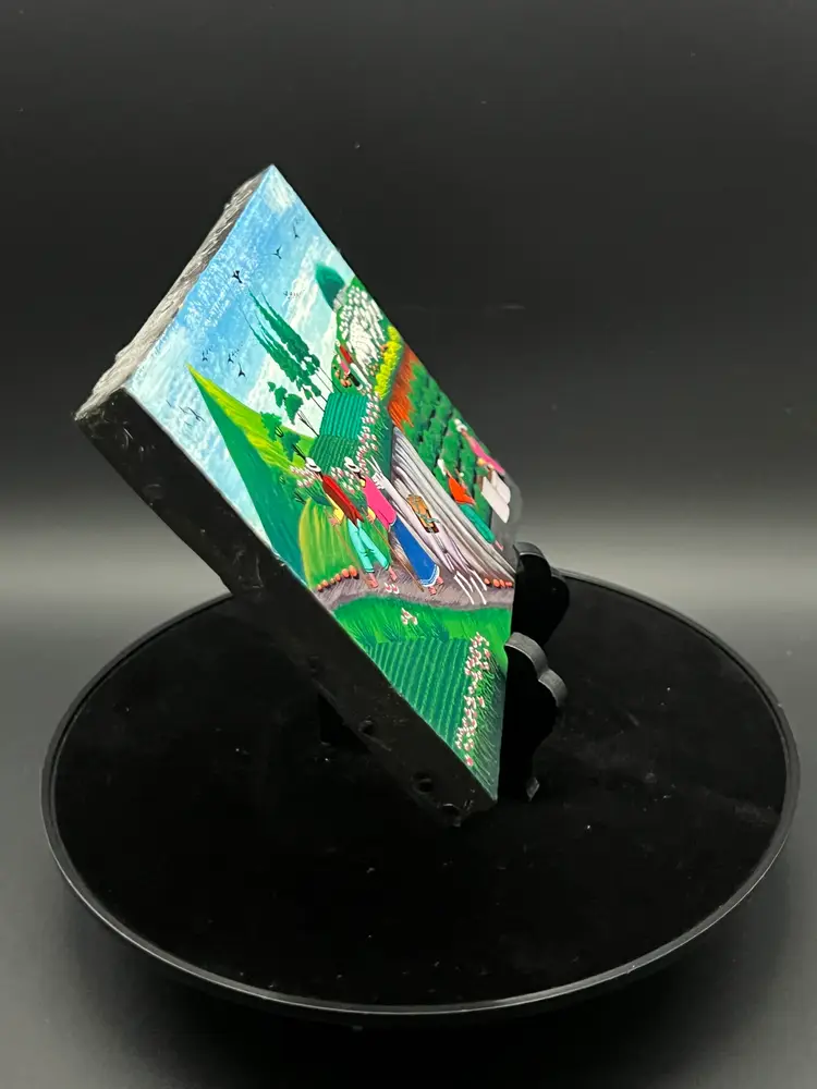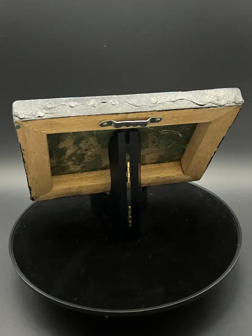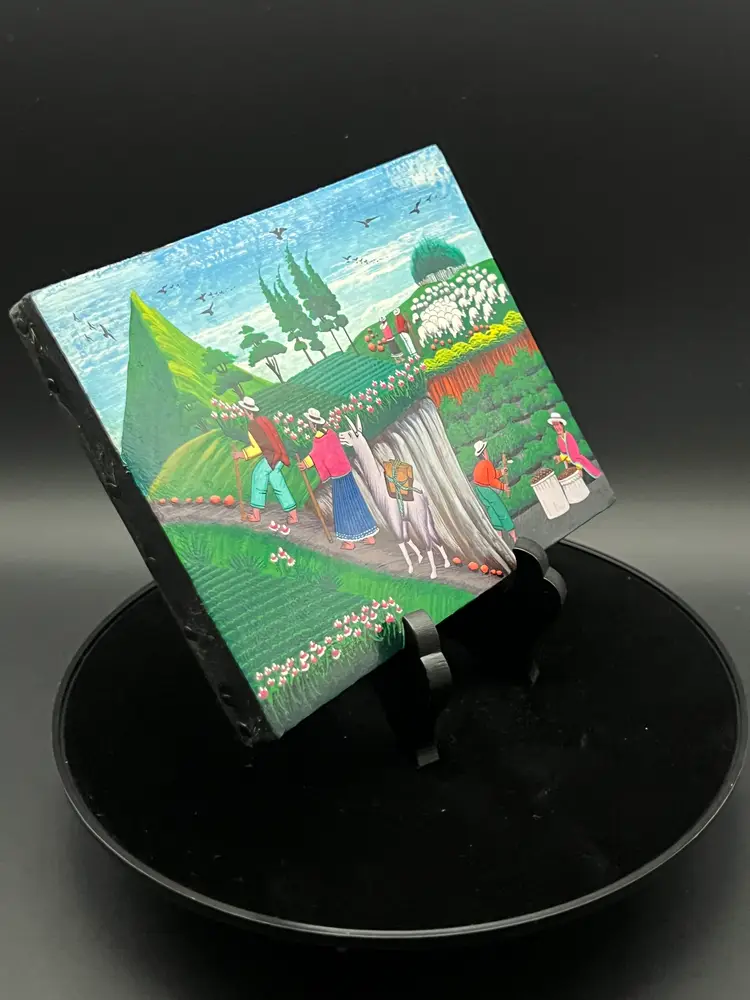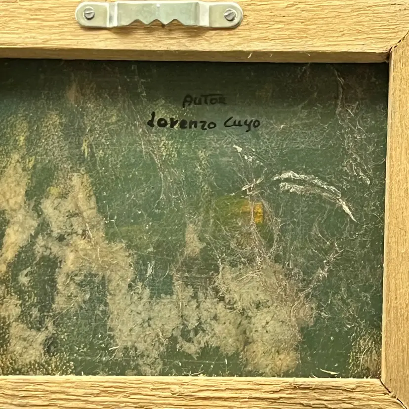 This wonderful piece was painted on sheepskin and signed “Lorenzo Cuyo.” It features a very colorful Ecuadorian pastoral scene painted in a high sheen. The painting is unframed with the hide nailed along the edges to a primitive wood stretcher. It is not completely symmetrical, making it a challenging candidate for framing. It is 6” wide and varies between 4.25” and 4.5” tall, taller on the right side.