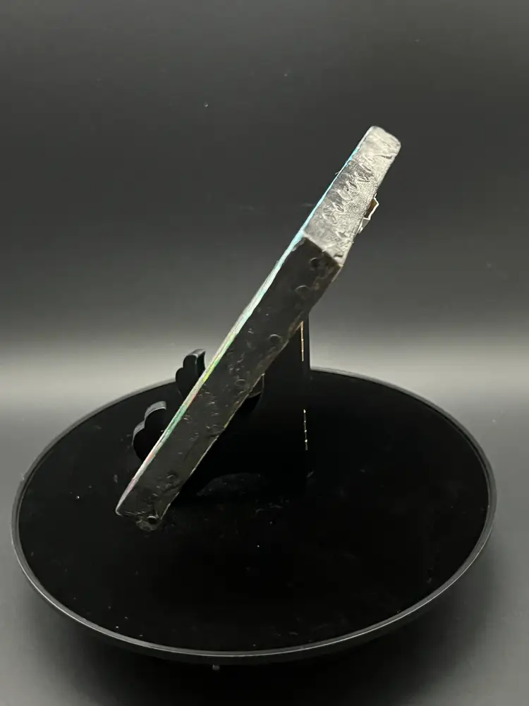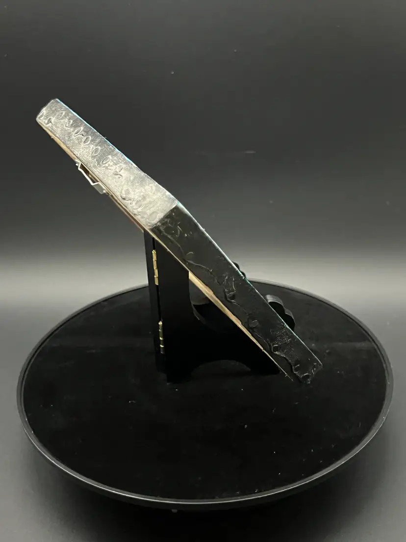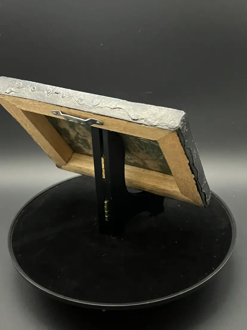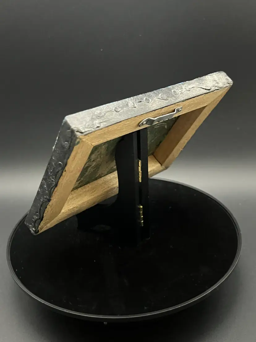 This wonderful piece was painted on sheepskin and signed “Lorenzo Cuyo.” It features a very colorful Ecuadorian pastoral scene painted in a high sheen. The painting is unframed with the hide nailed along the edges to a primitive wood stretcher. It is not completely symmetrical, making it a challenging candidate for framing. It is 6” wide and varies between 4.25” and 4.5” tall, taller on the right side.