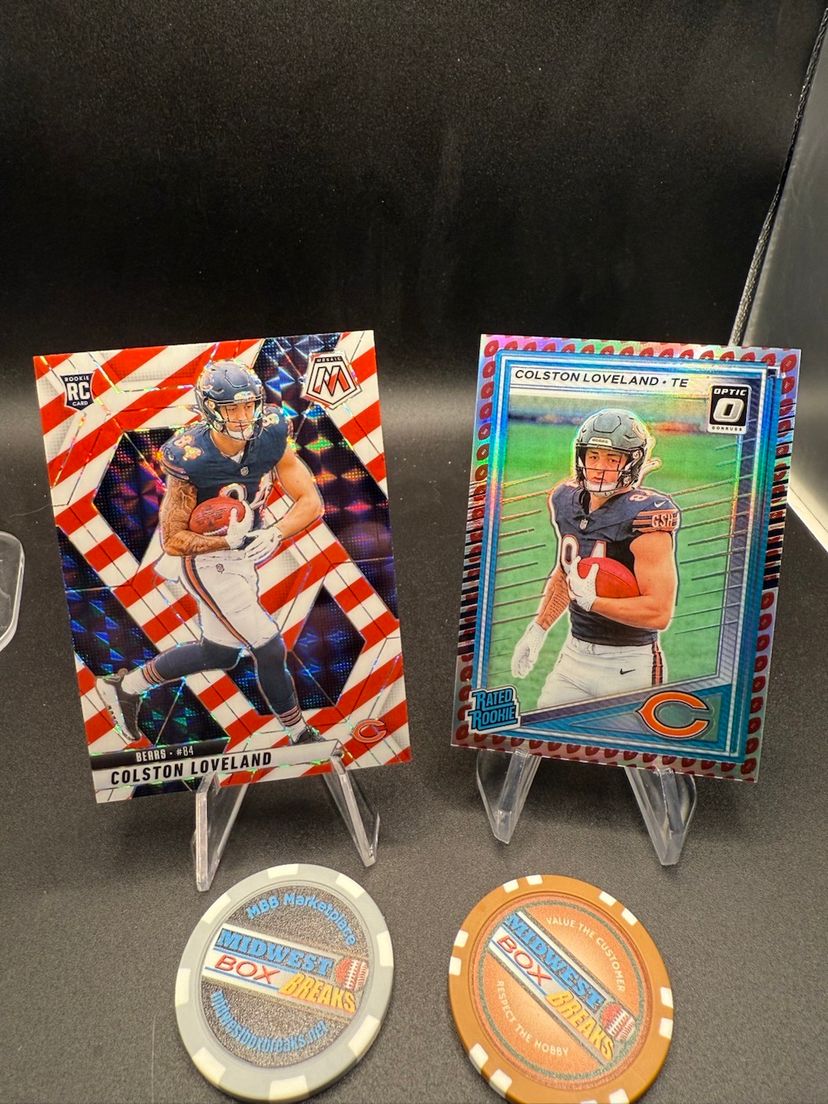 This is a 2-card Colston Loveland RC parallel lot. Mosaic holiday red/white parallel and the sp football emoji optic prizm. Chicago bears rookie.