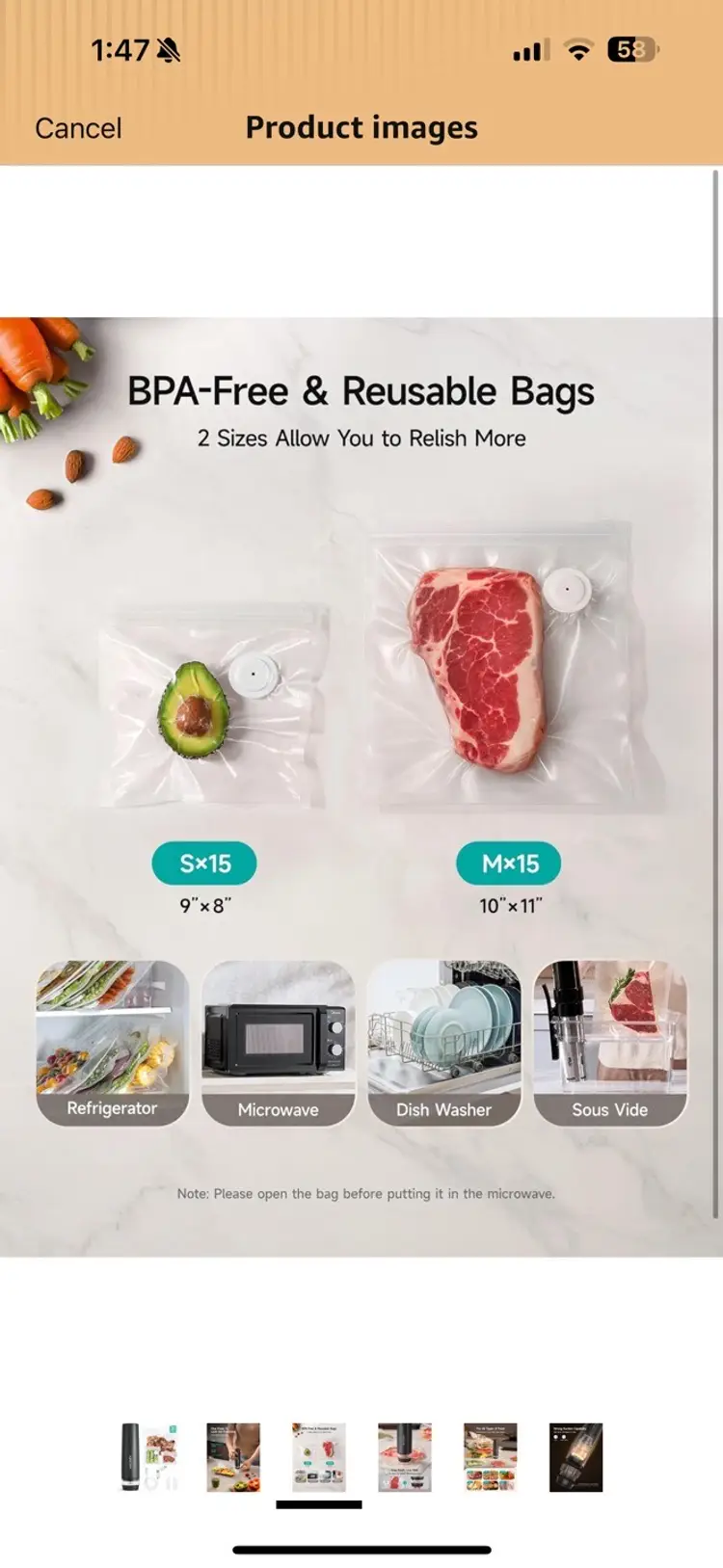 BPA-Free & Reusable Bags: The included vacuum sealer bags for food are BPA-free, easy to clean, reusable, suitable for freezer, microwaves, dishwashers, and sous vide. It has two sizes: S15 (9” X 8”) and M15 (10” X 11”) for various storage needs. Note: Open the bag before putting it in the microwave.