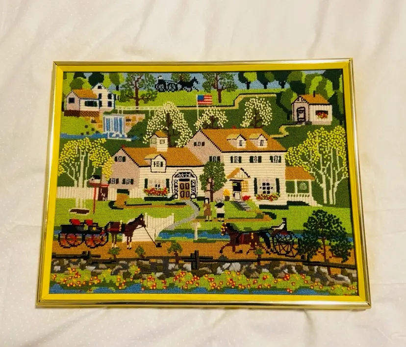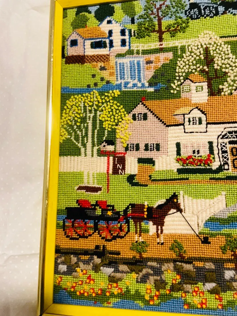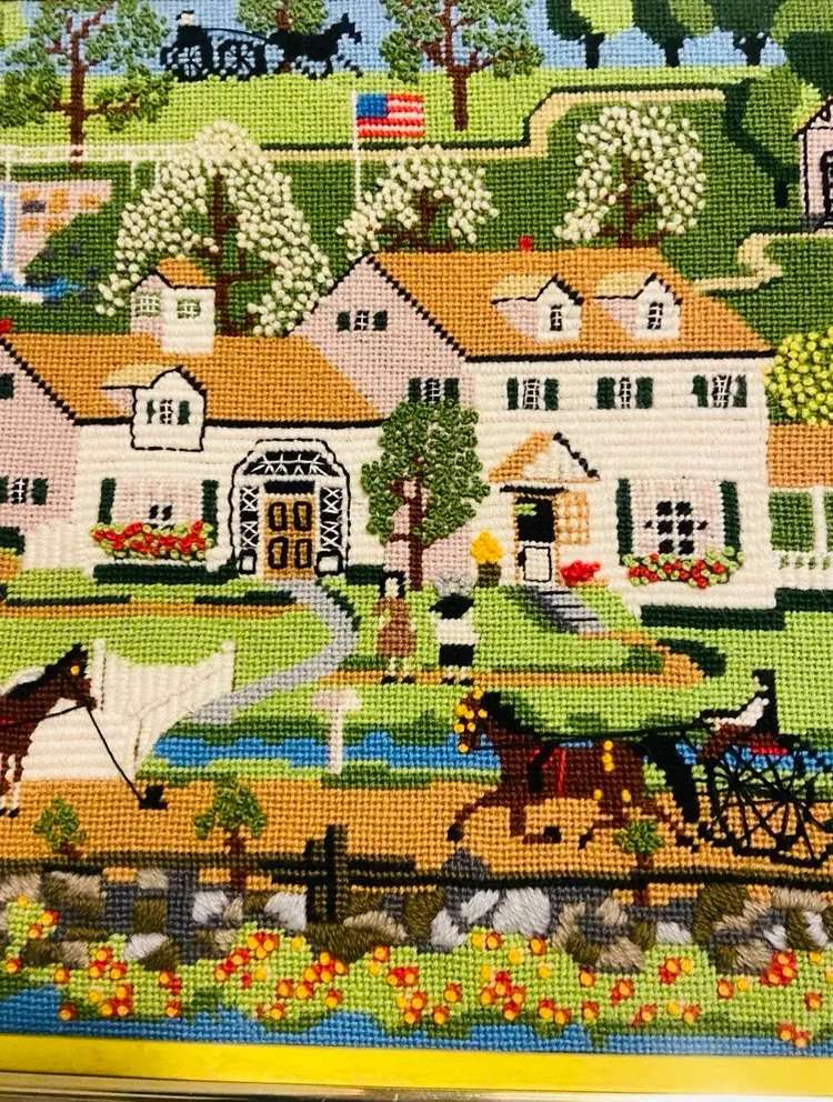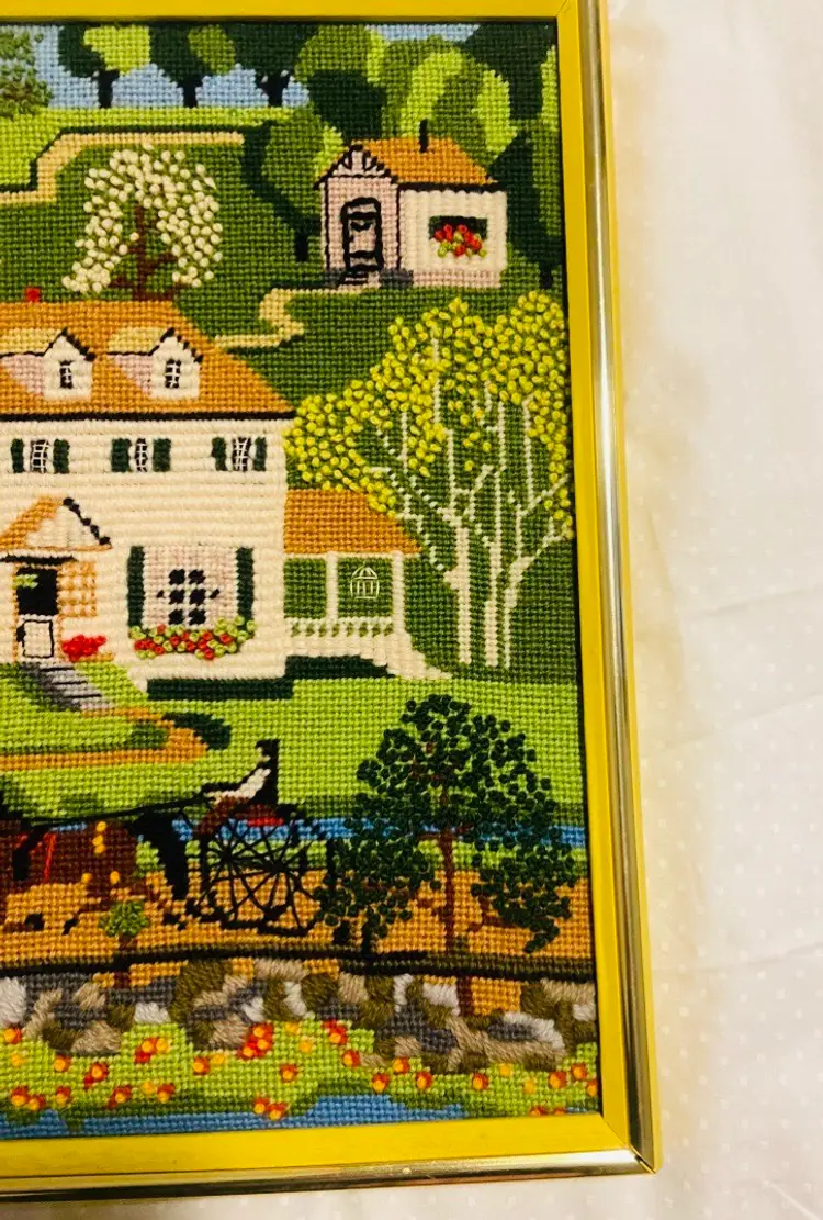 Add a touch of timeless charm to your home with this beautifully detailed crewel embroidery. This handcrafted textile artwork features a serene countryside scene with horse-drawn carriages, a grand house, lush trees, and beautiful trees. All meticulously stitched with vibrant, textured threads. In good used condition.