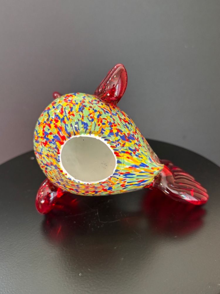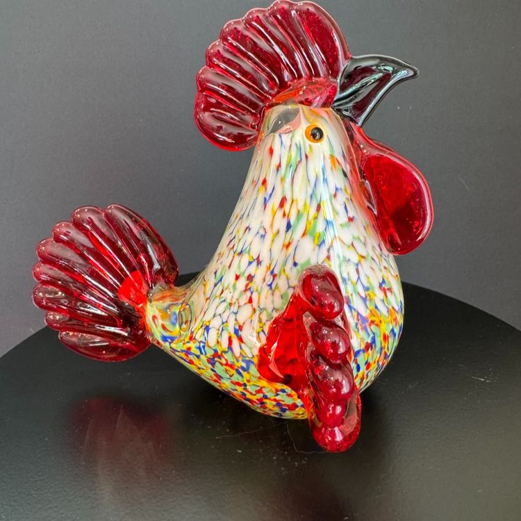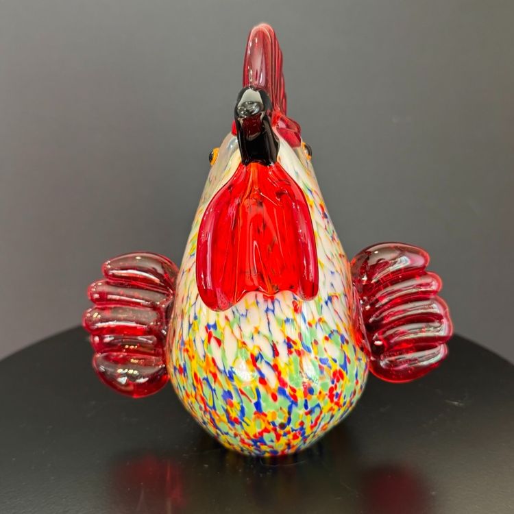 Awesome confetti glass chicken. Weighs a little over 2 pounds. No chips or cracks. Measures about 6 inches tall and about six wide.
