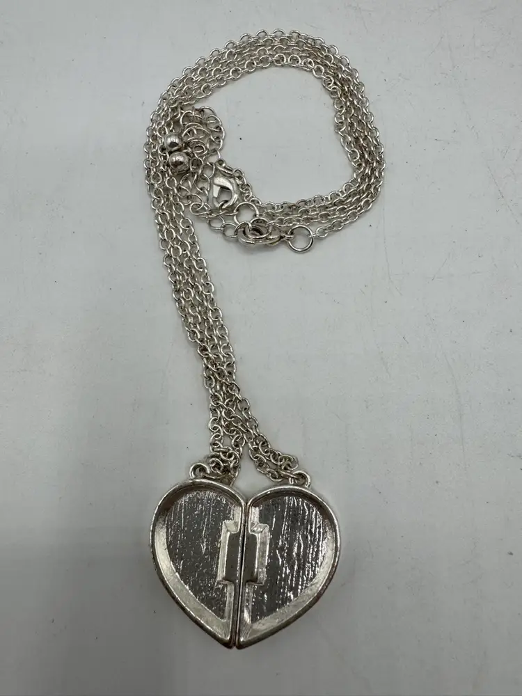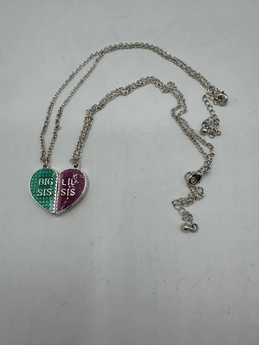 This is a cute pair of silver tone necklaces with a magnet to connect them. Lobster claw clasps. Perfect for "Big Sis & Little Sis" to wear together. The necklaces are adjustable in length, both are 16” with 3” extenders. The enameled charm pendant adds a sweet touch to the jewelry, making it a unique and stylish accessory for sisters to treasure. Good condition.