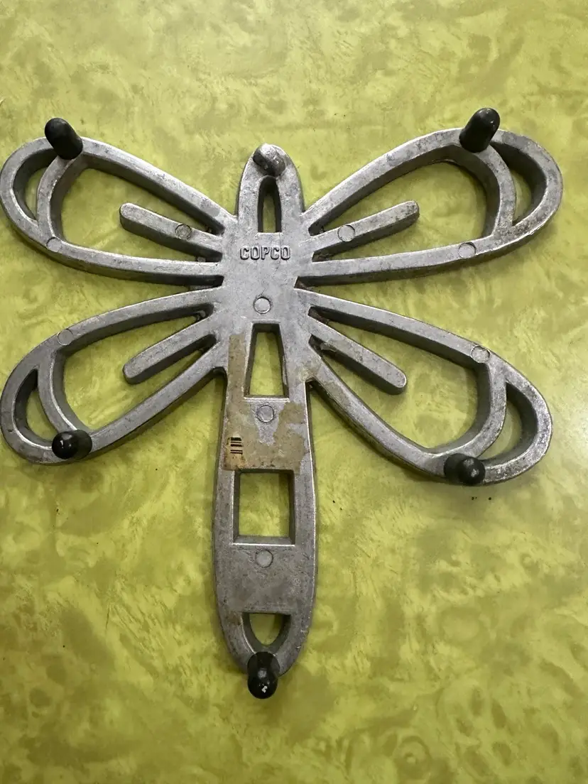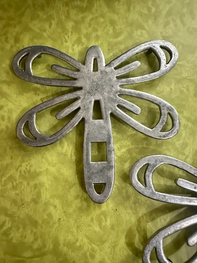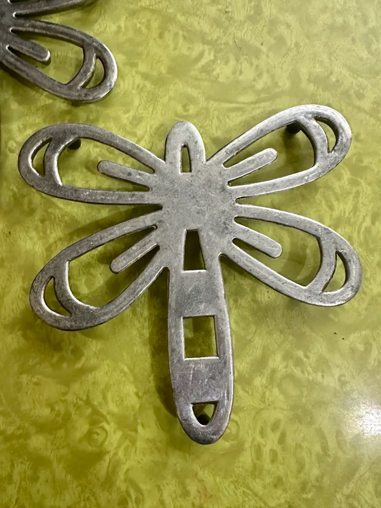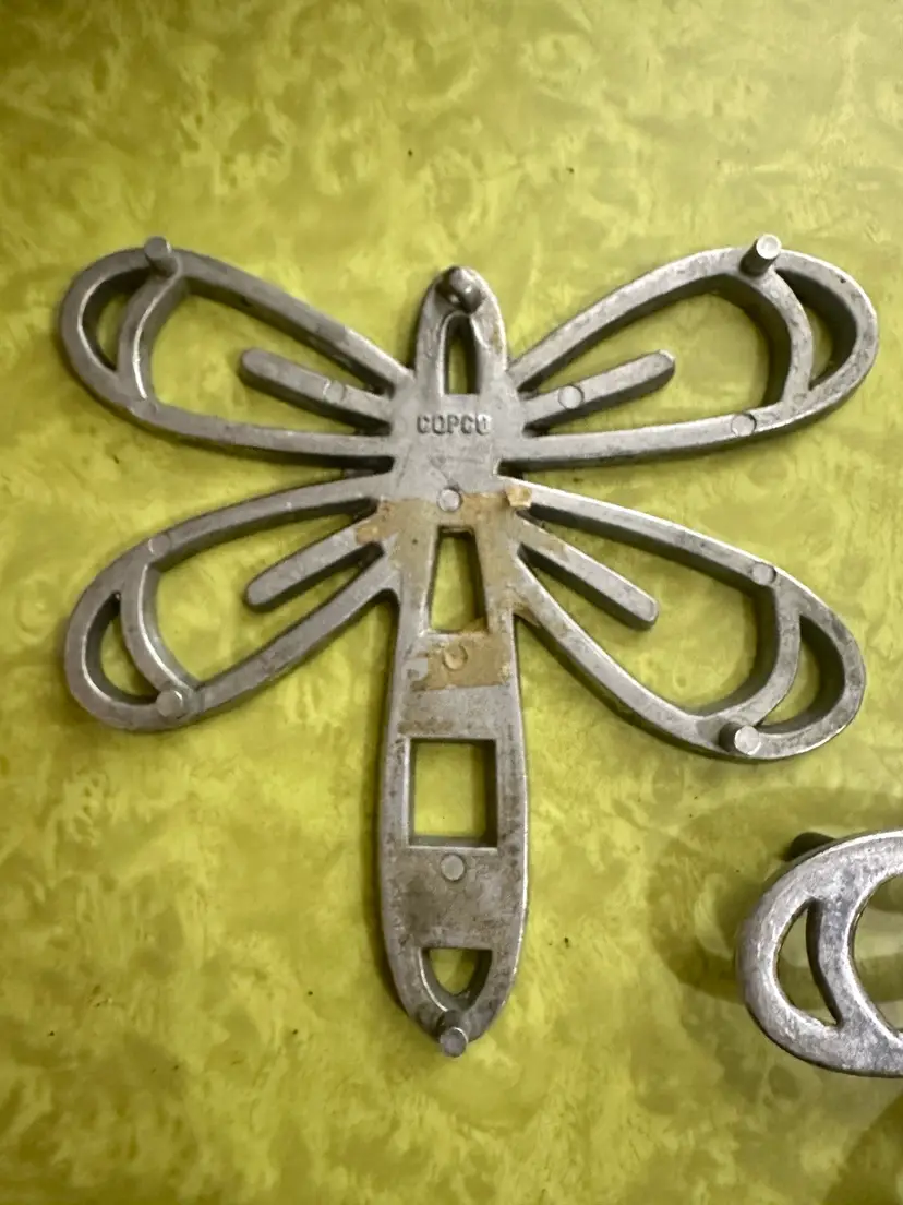 Can be trivets or wall hangings 6.5” x 6.5” Some patina to the metal One is missing the rubber pegs