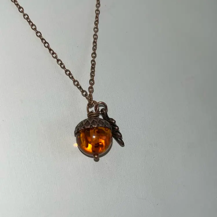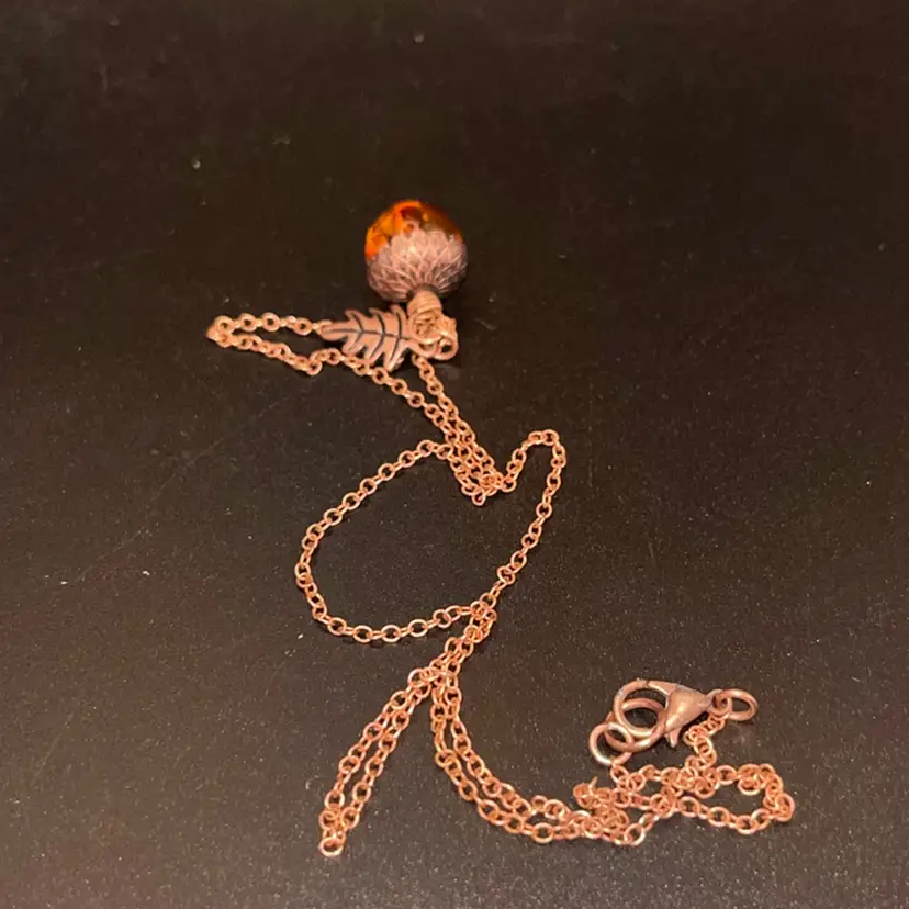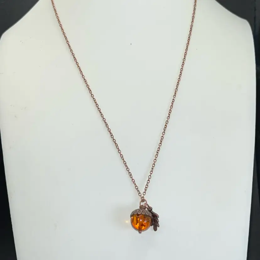 Copper Orange Glass Acorn Necklace, Lobster Clasp20” Long