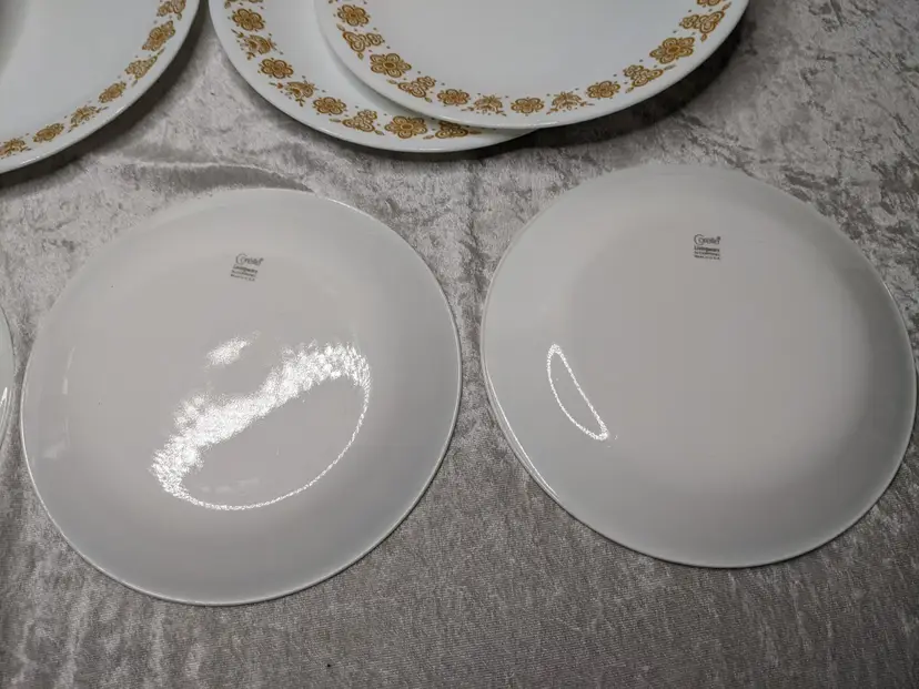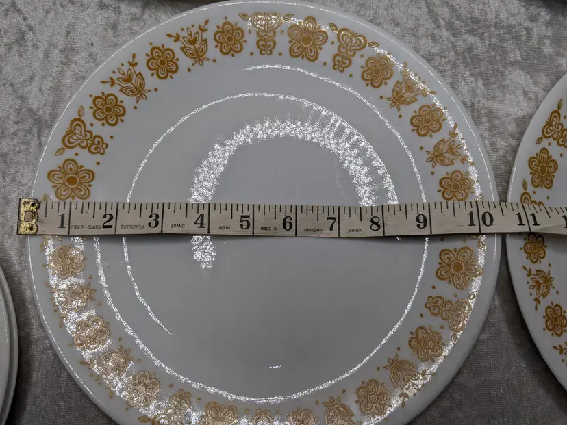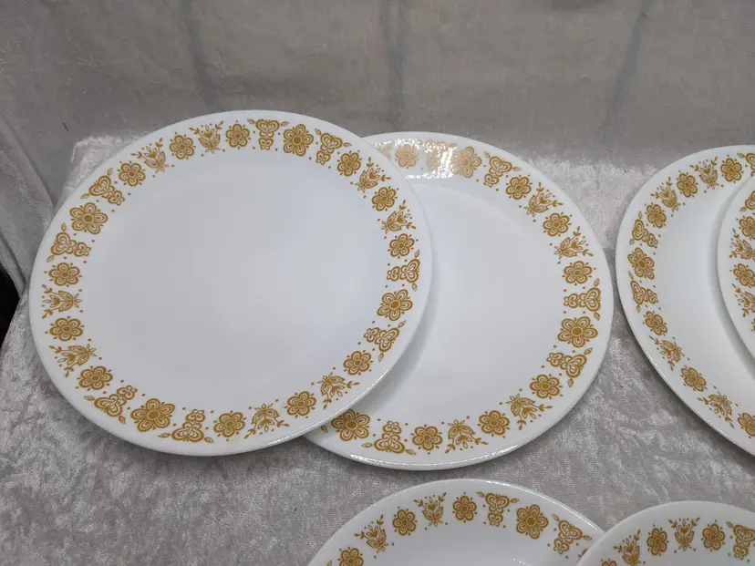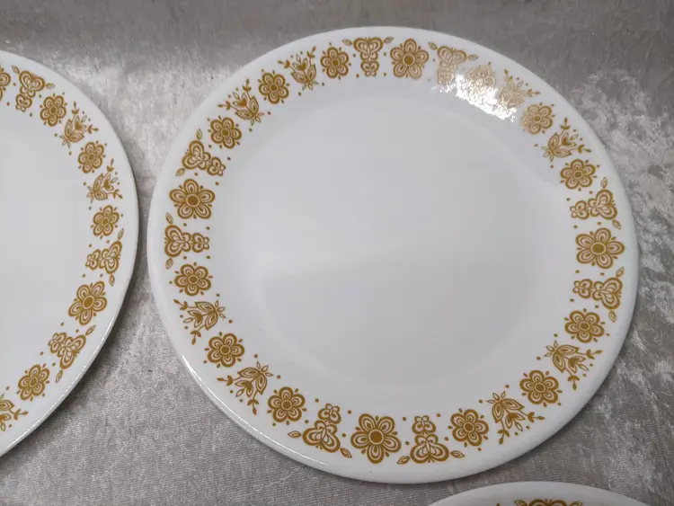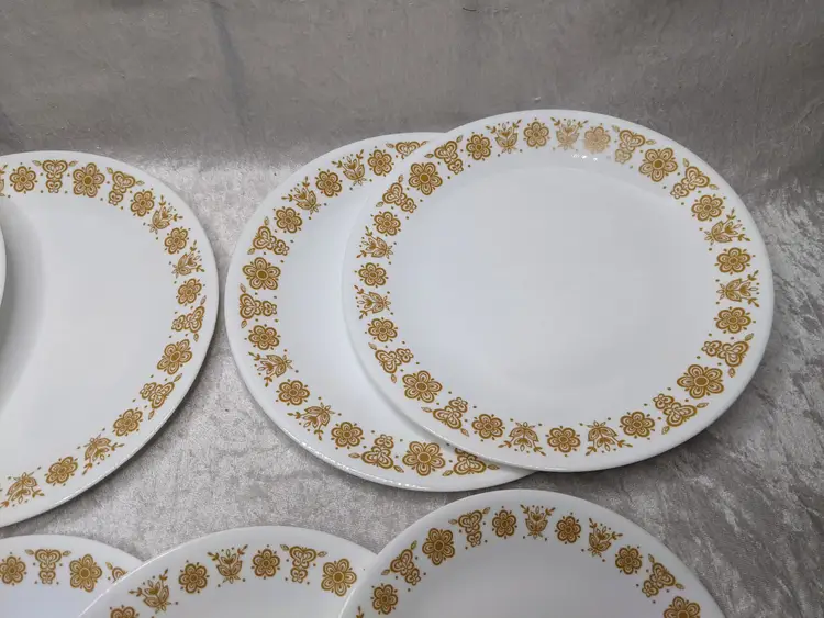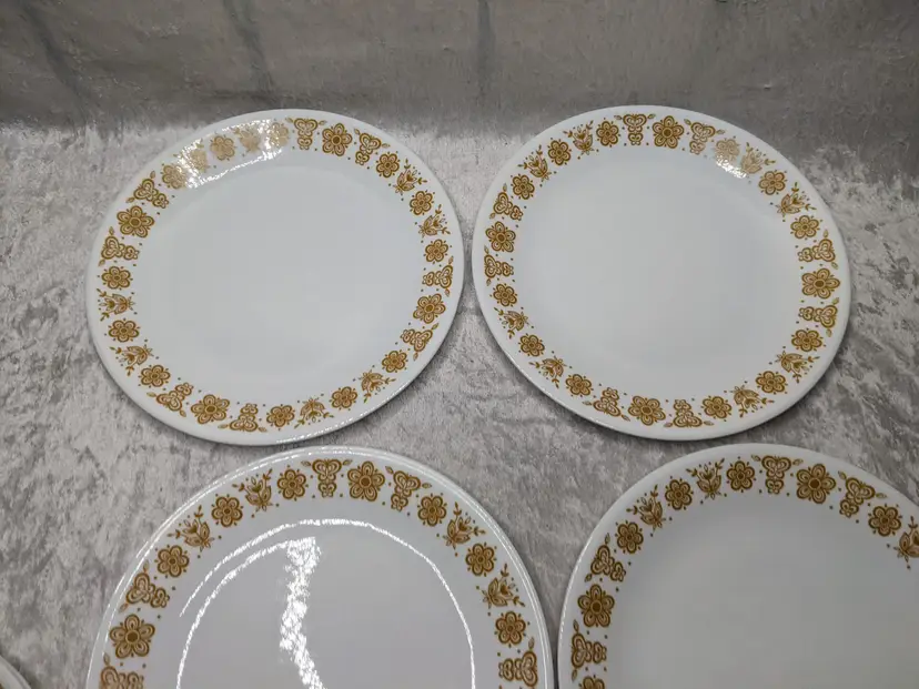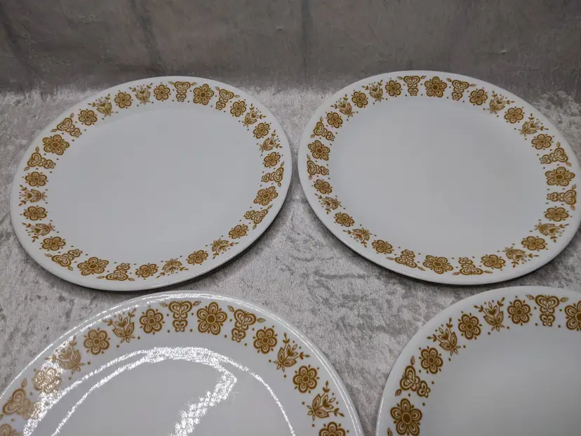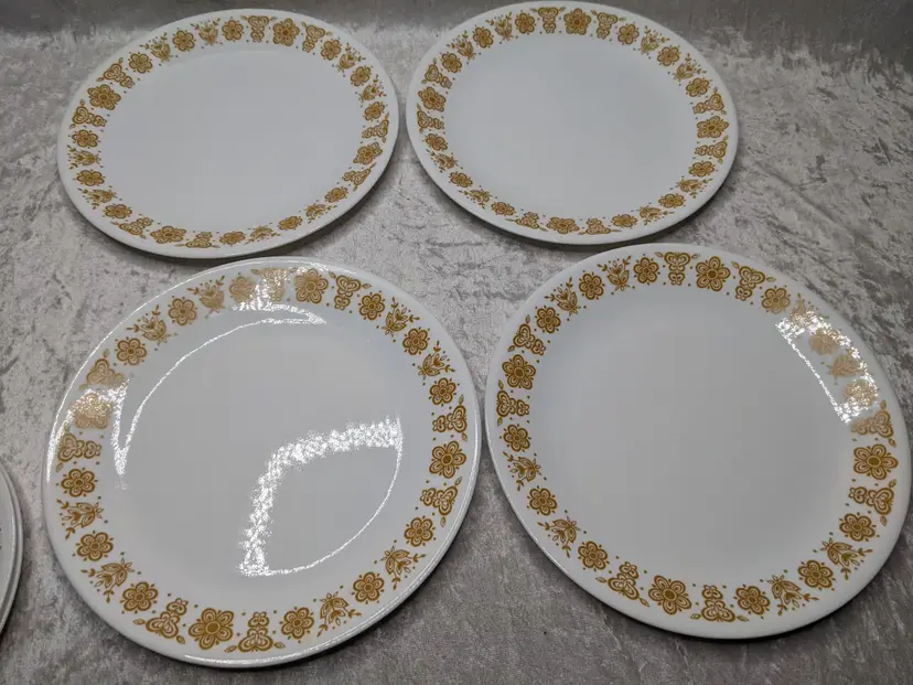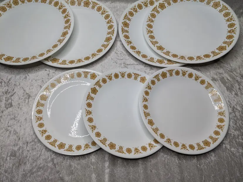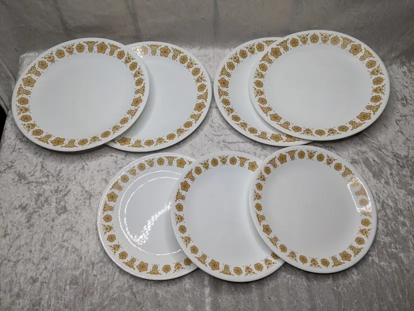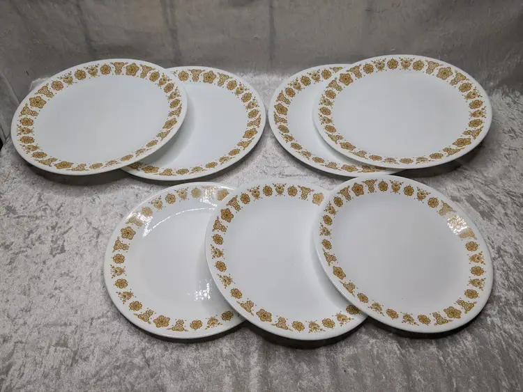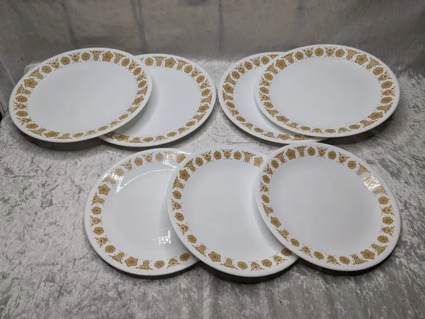 Corelle Livingware Butterfly Gold Dinnerware 10IN 4 Dinner 8.5" 3 salad Lunch Plates made by Corning In the USA. Vintage . Nice to add to your set for the holidays. This Item can be shipped USPS Ground or Ups Please contact me if you would like to know that shipping cost. Great condition Clean with no damage no utensil marks, no chips or cracks no weird smells. Please check the photos for details. Comes from a smoke free home. We do have pets.