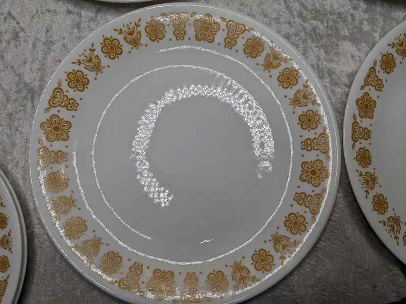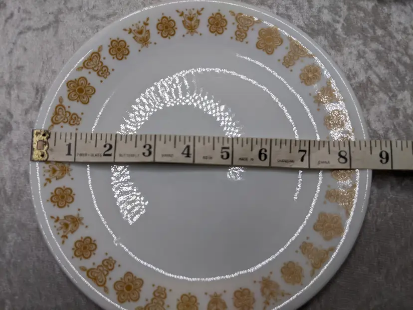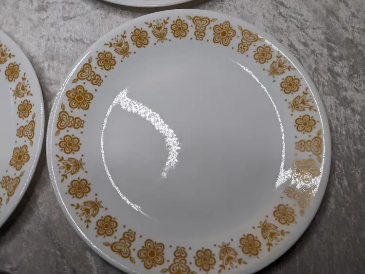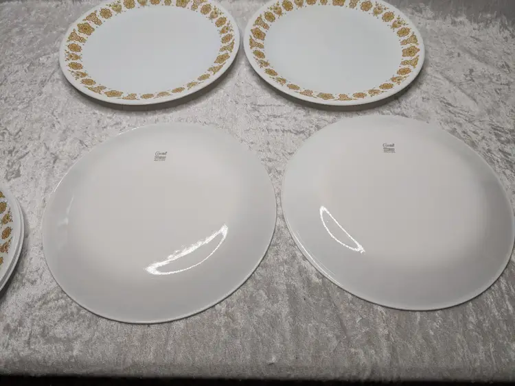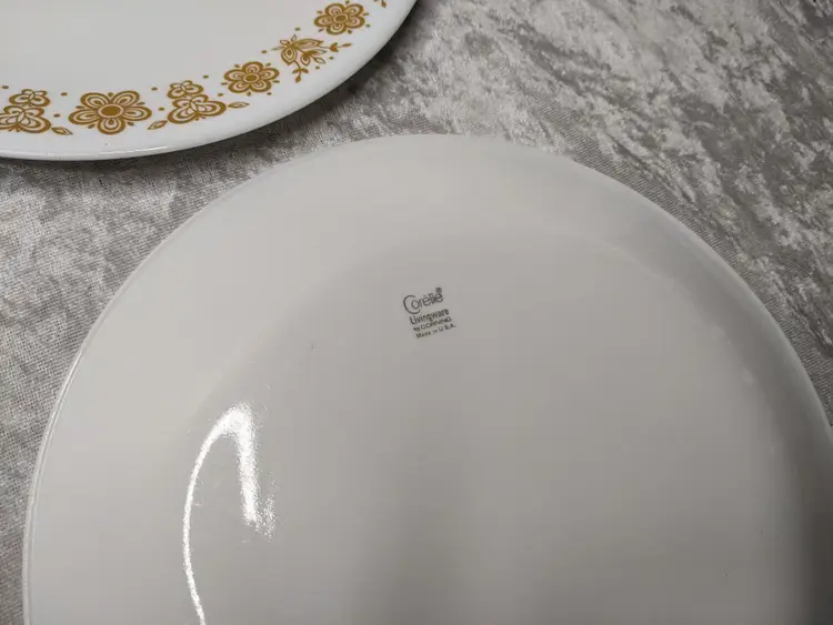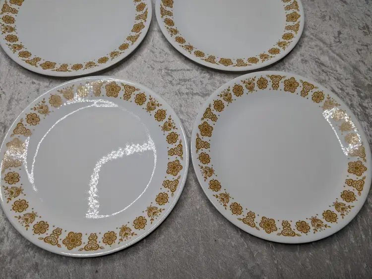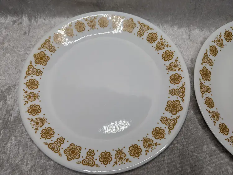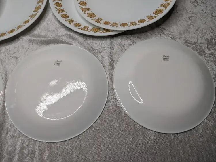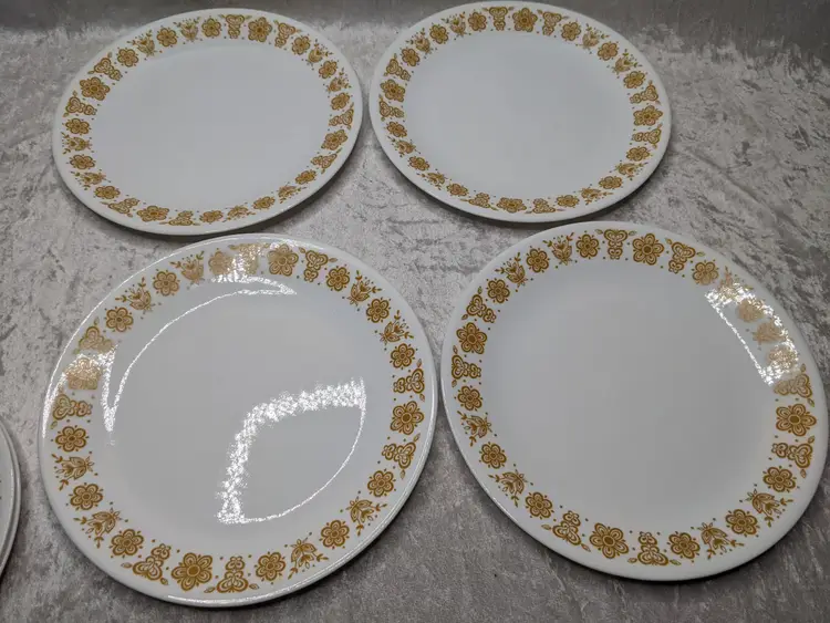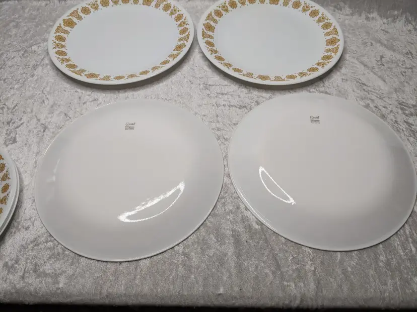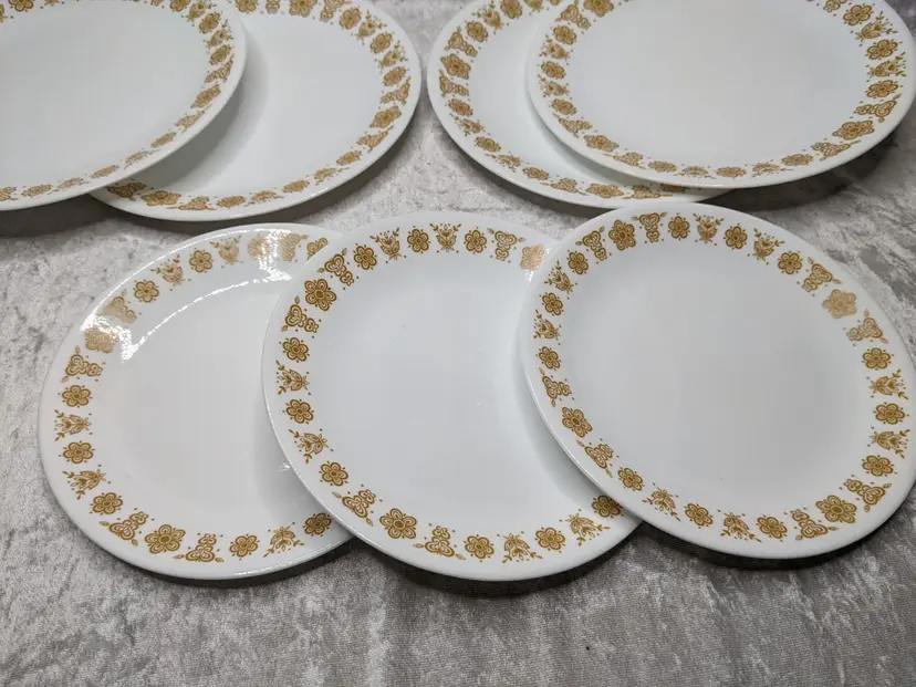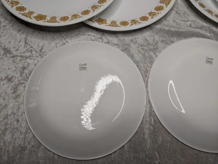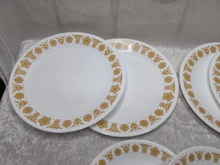 Corelle Livingware Butterfly Gold Dinnerware 10IN 4 Dinner 8.5" 3 salad Lunch Plates made by Corning In the USA. Vintage . Nice to add to your set for the holidays. This Item can be shipped USPS Ground or Ups Please contact me if you would like to know that shipping cost. Great condition Clean with no damage no utensil marks, no chips or cracks no weird smells. Please check the photos for details. Comes from a smoke free home. We do have pets.