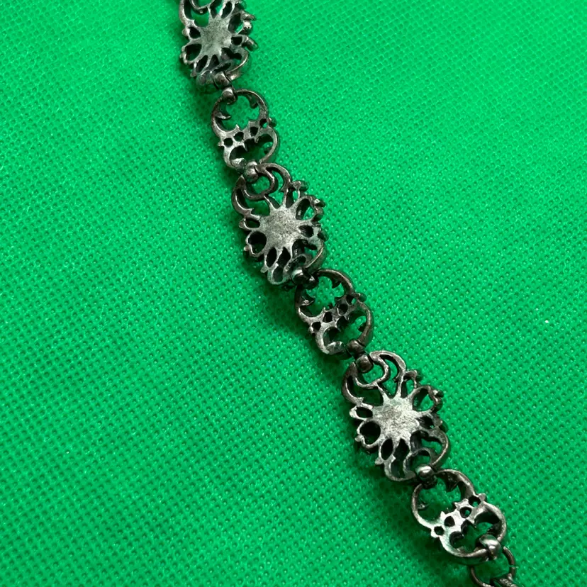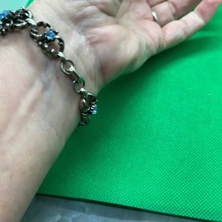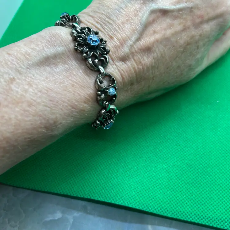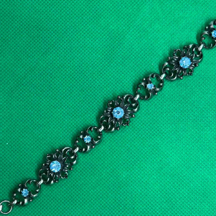 Signed Coro linked flower bracelet with light blue rhinestones. In excellent vintage condition. 7.5 inches. In my research I found that the Coro signature style on this piece indicates it is from the 1940s. Please see photos as they are part of the description. Thank you for looking!